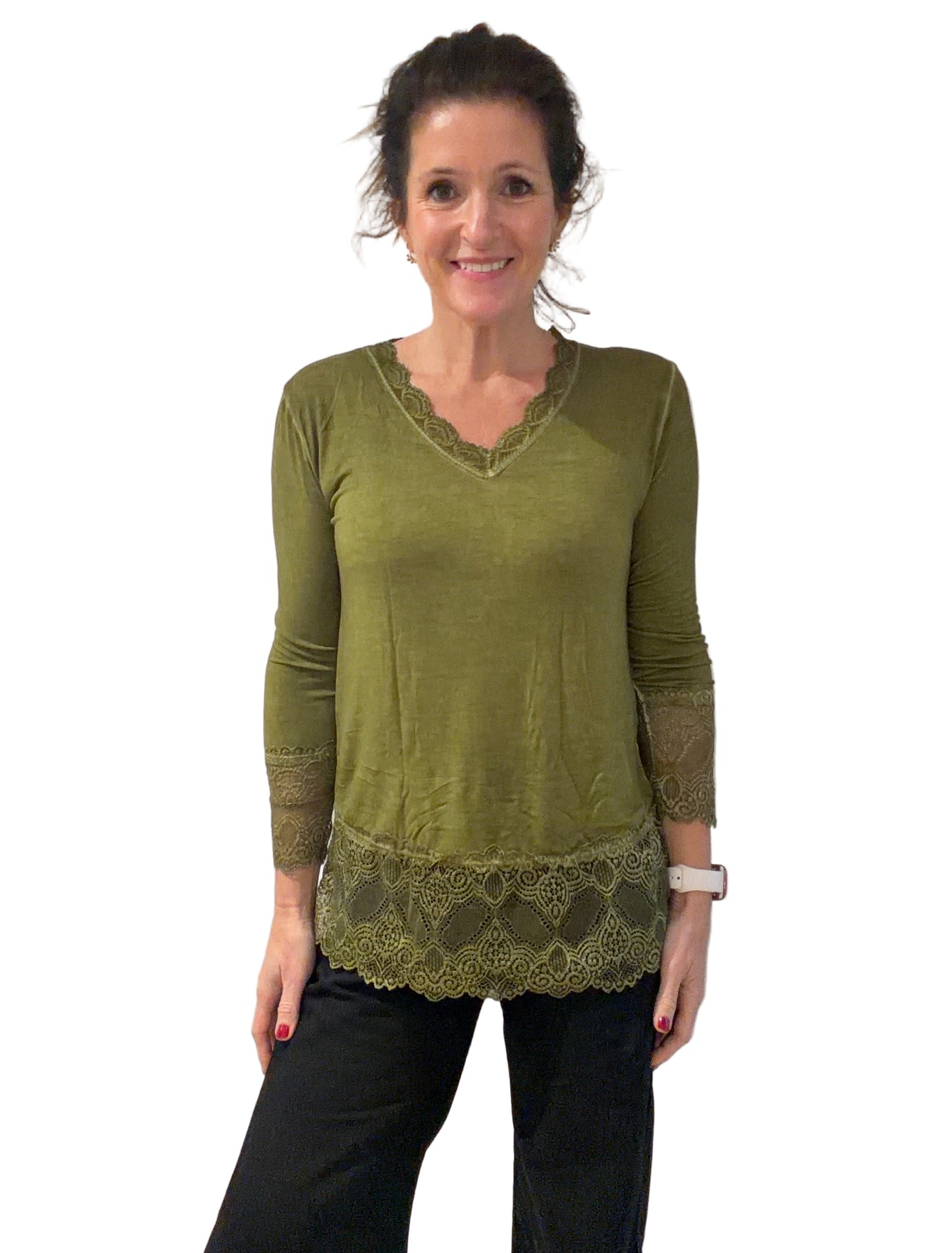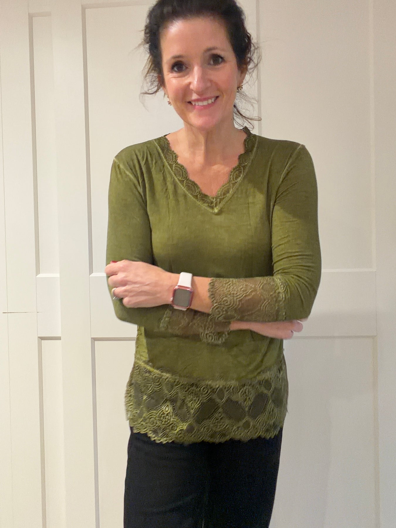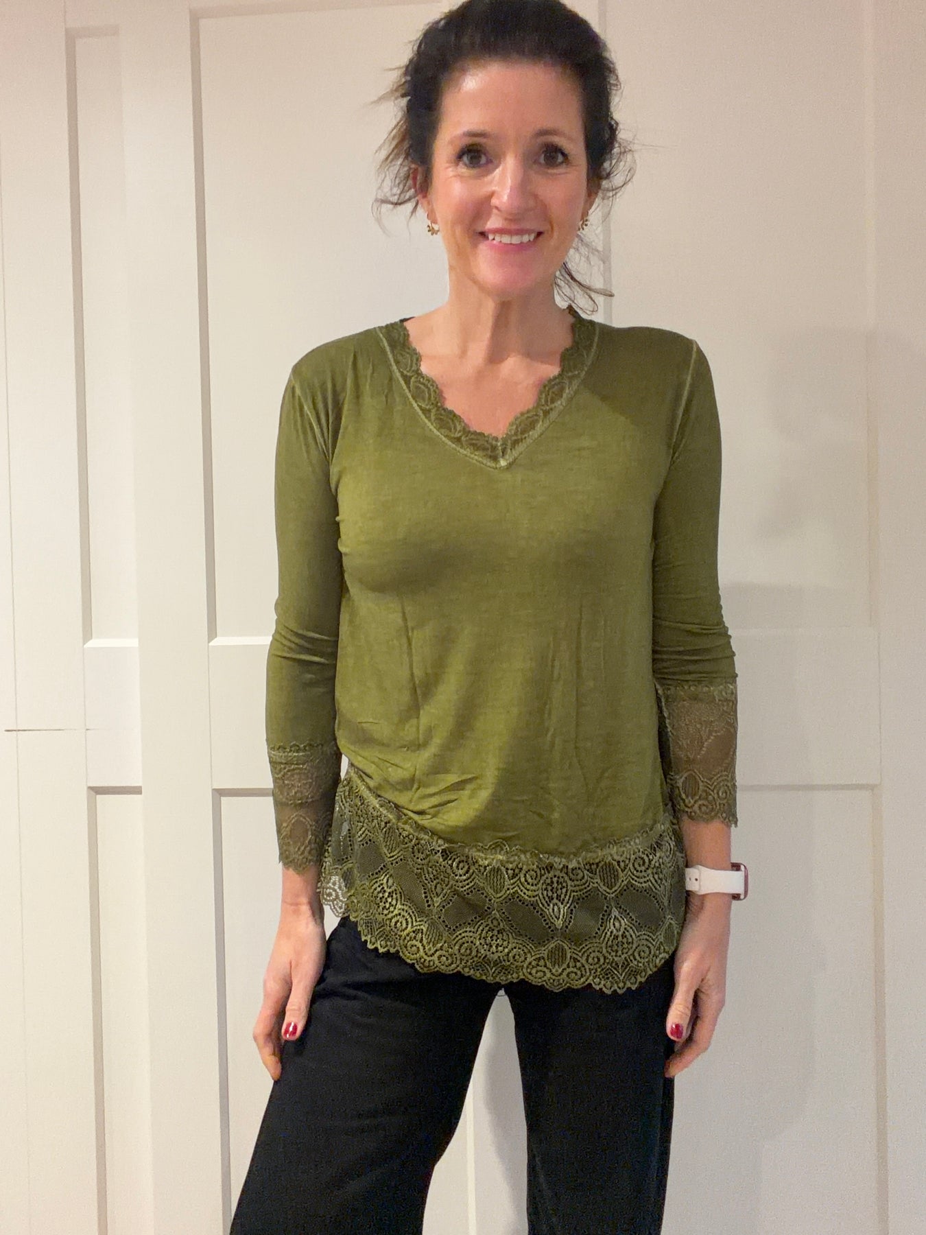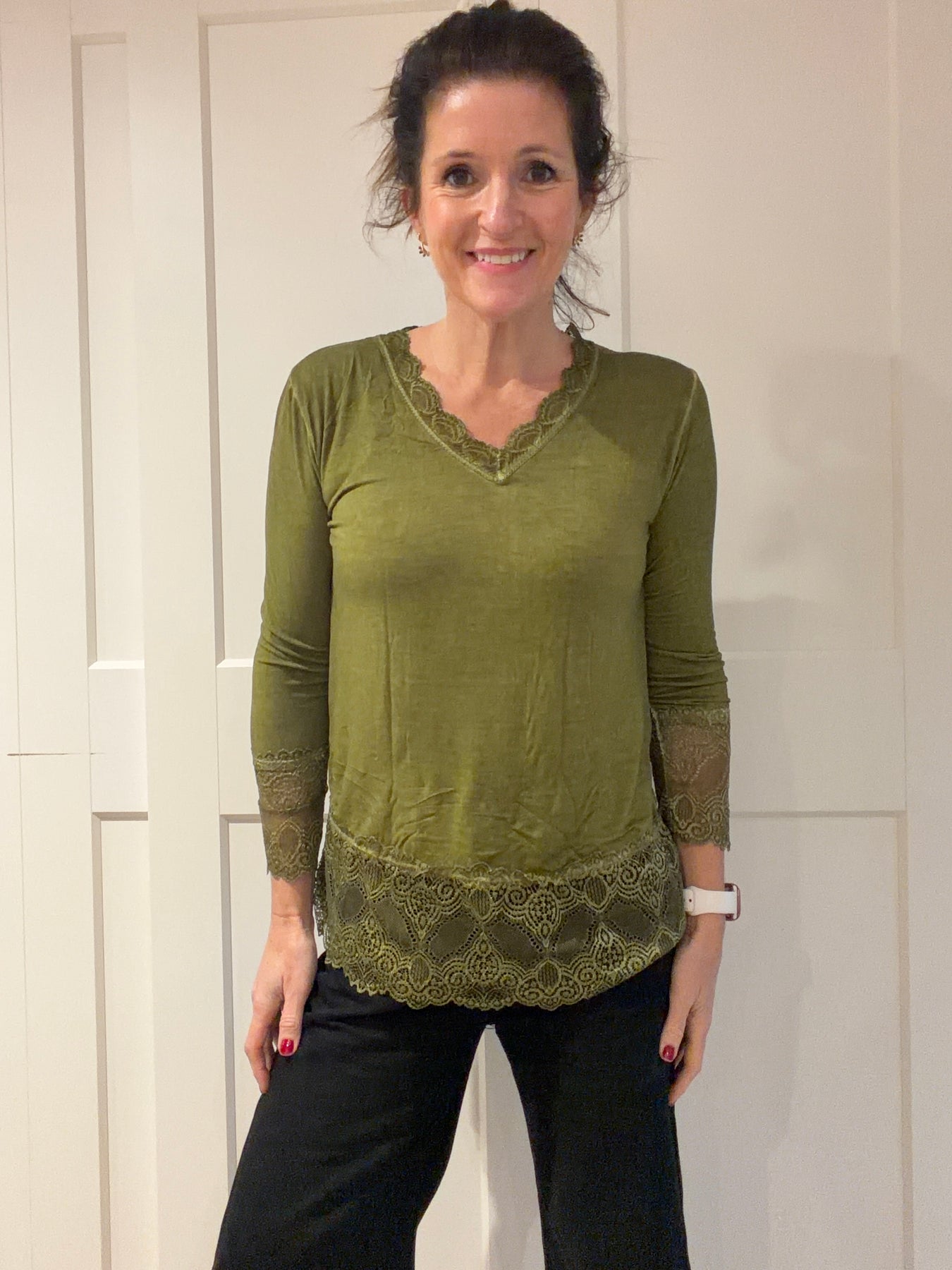 Lace Edge Olive Long Sleeve Layering Top