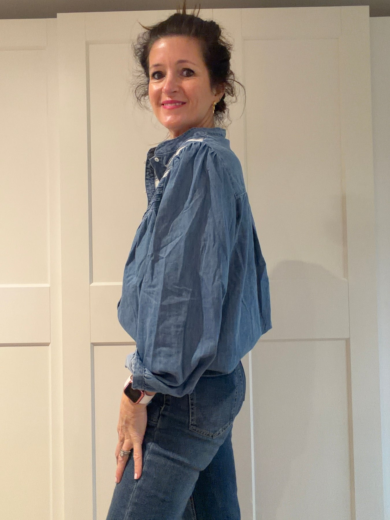 A useful denim shirt with pretty broderie detail in a flattering v shape neckline