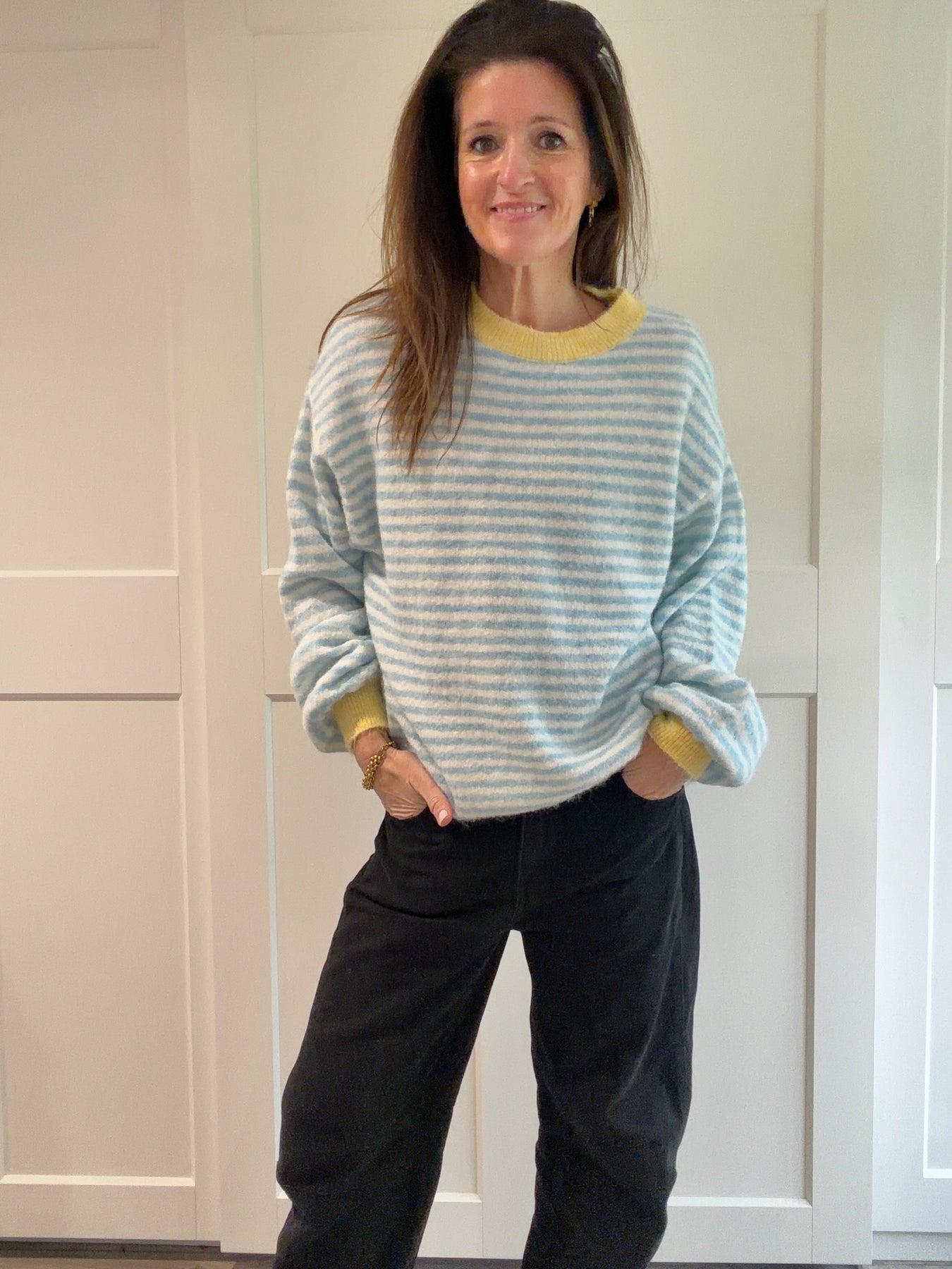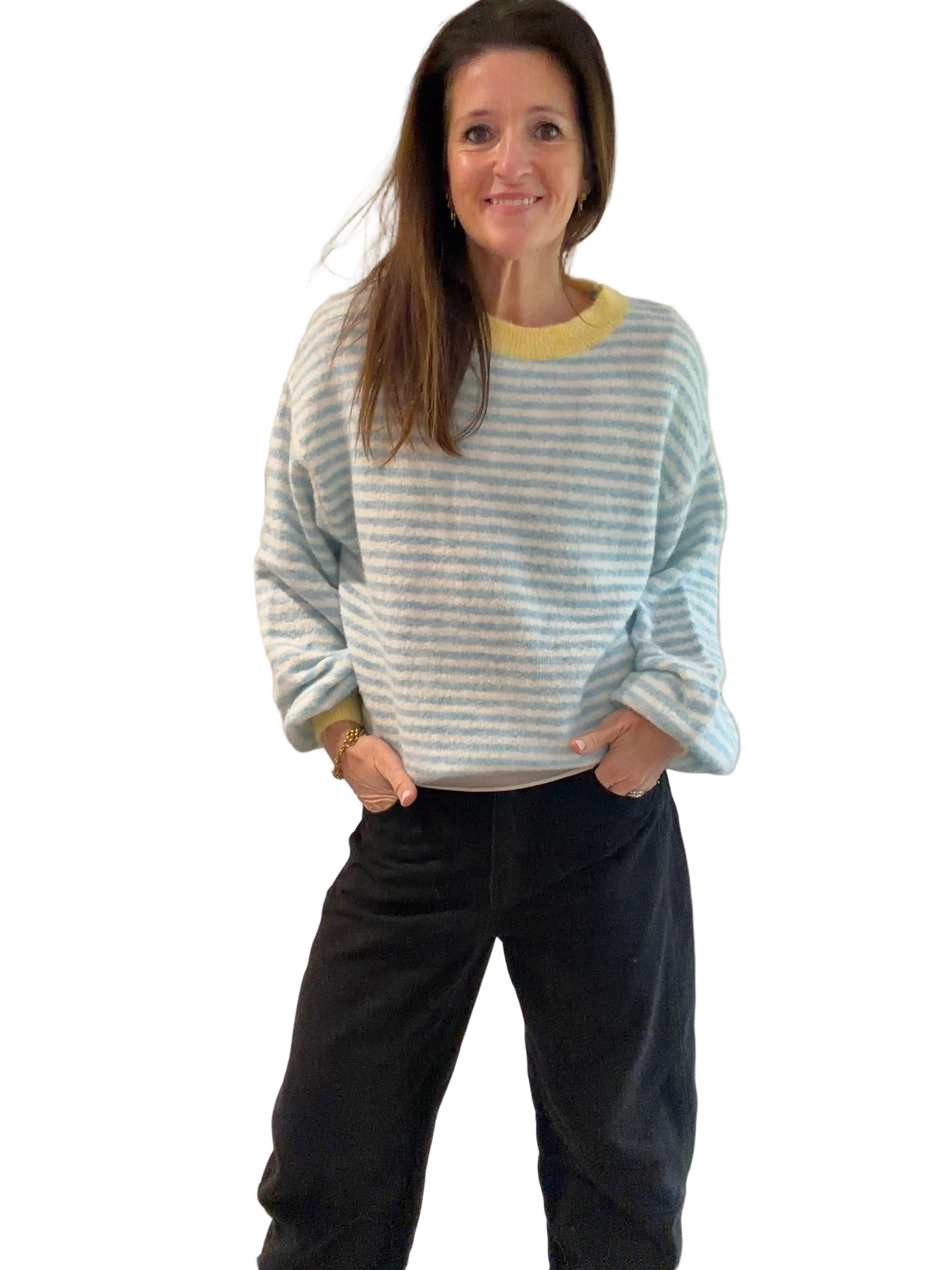 Nod to Spring in this gorgeous pastel slouchy stripe jumper with contrasting collar & cuff