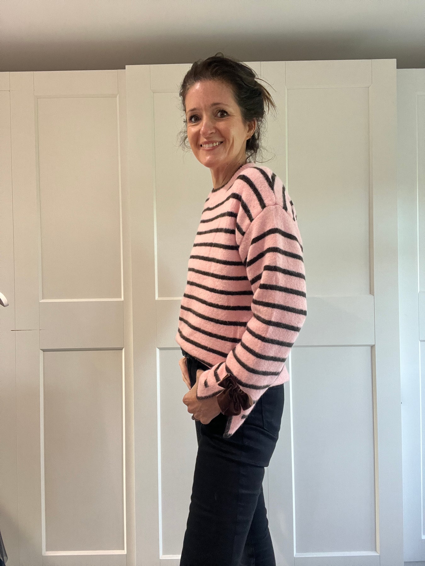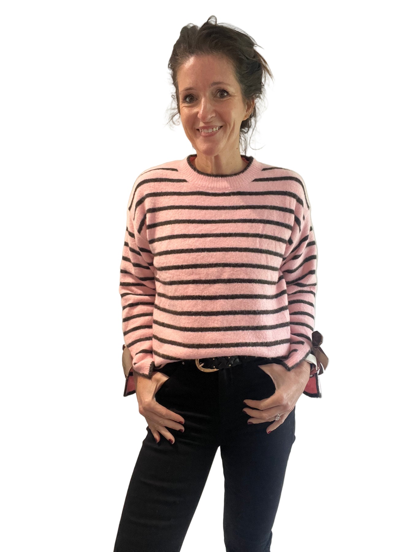 A gorgeous super soft stripe jumper with chocolate brown velvet bows on the cuff