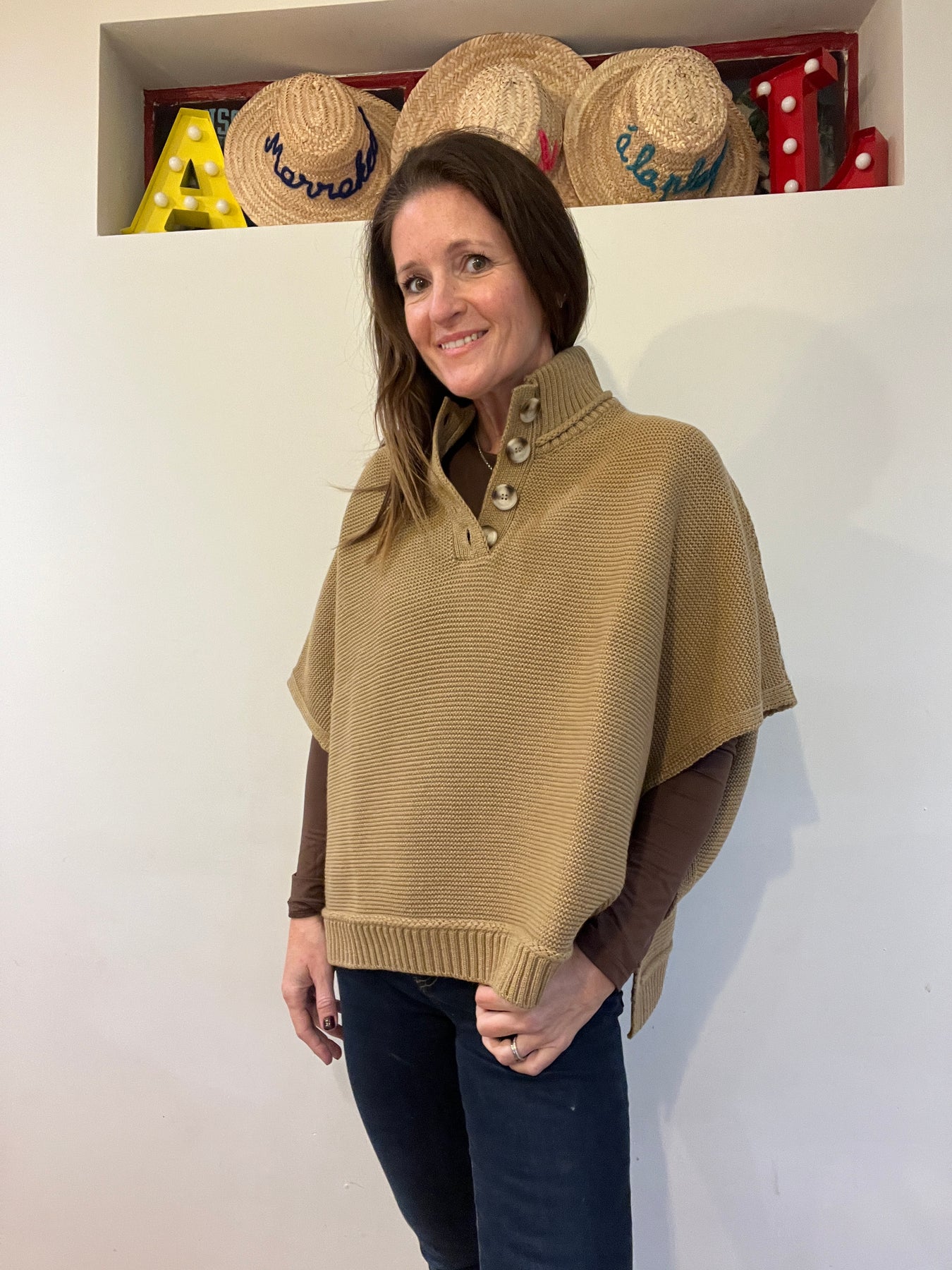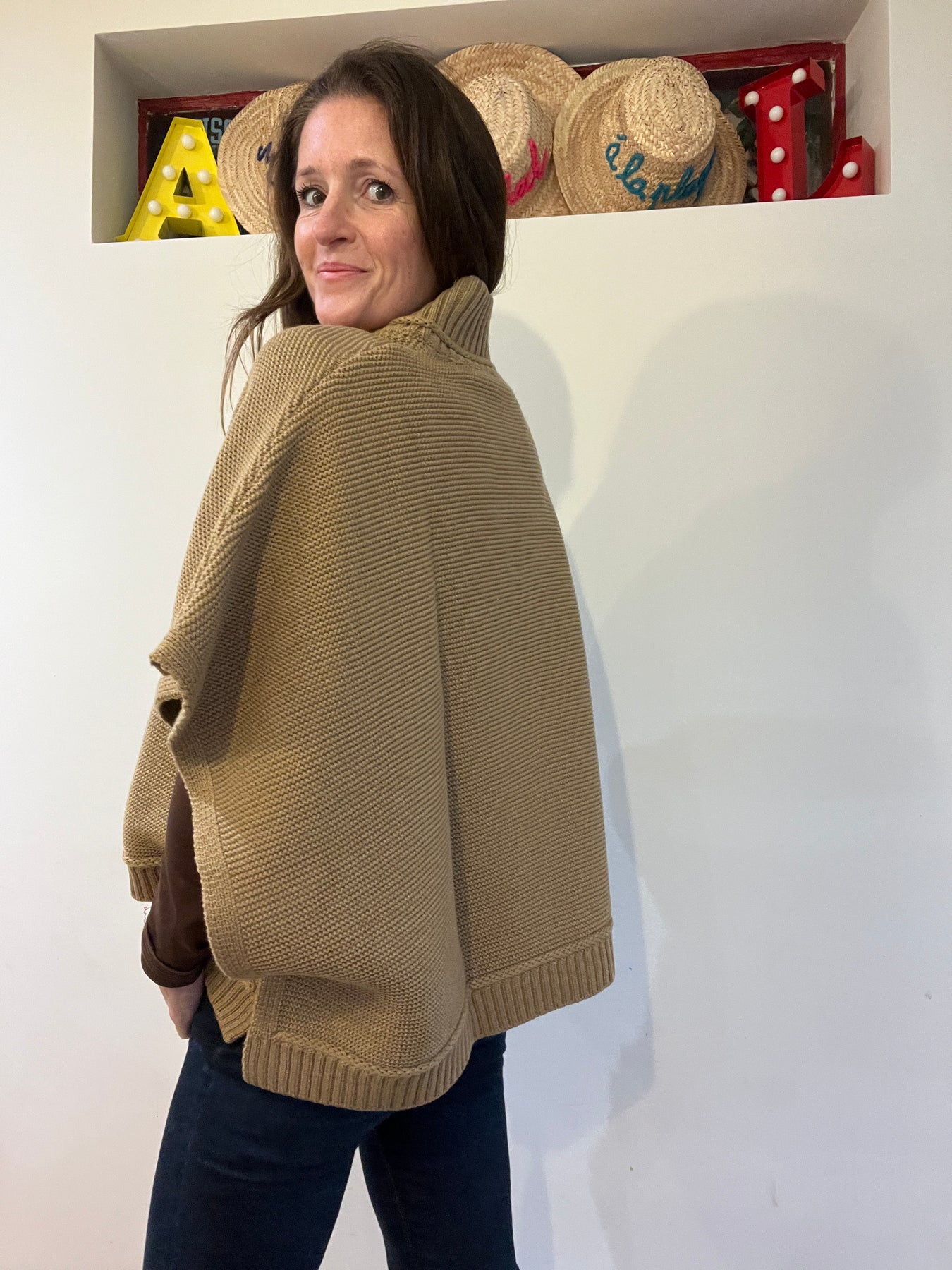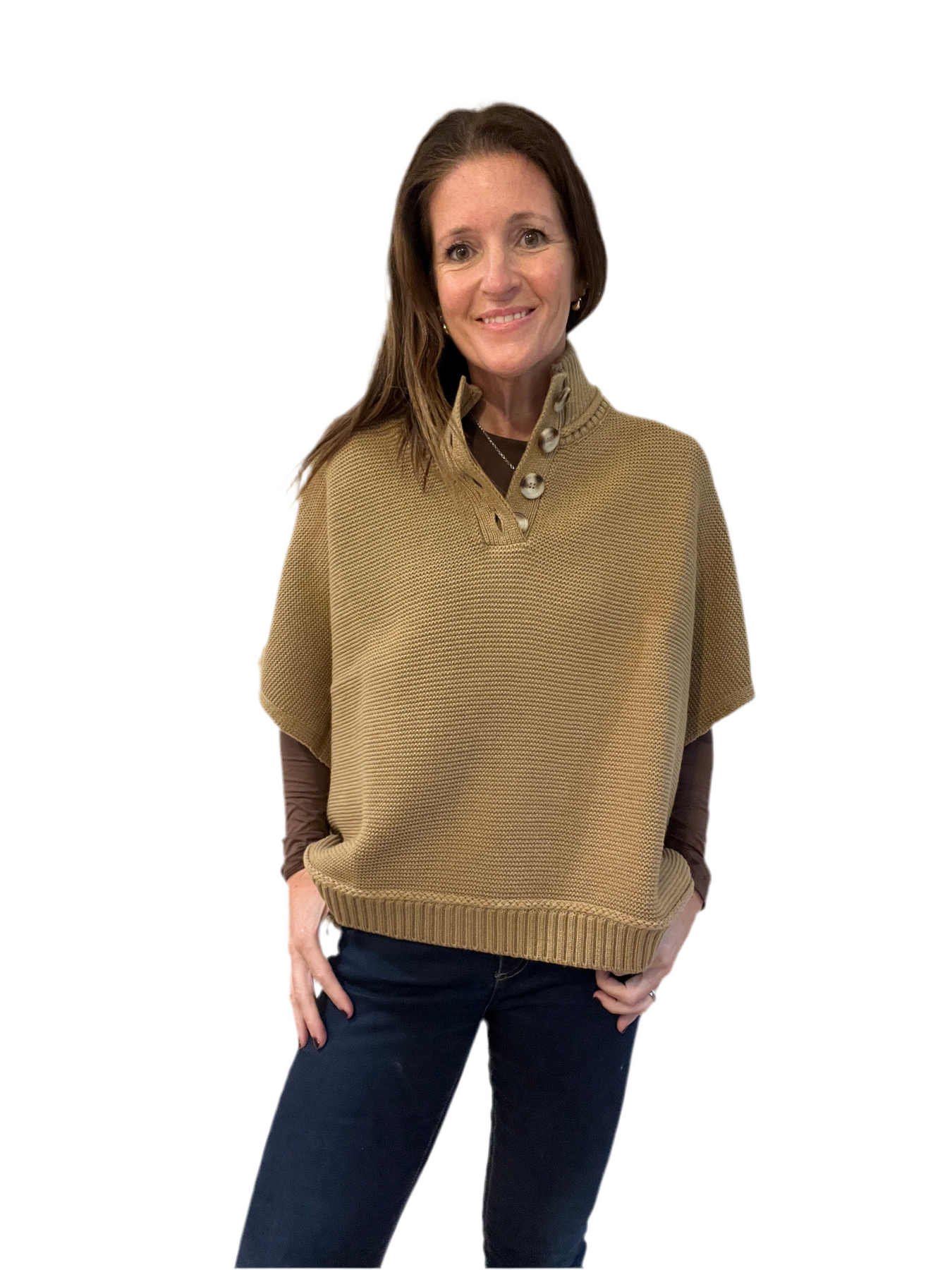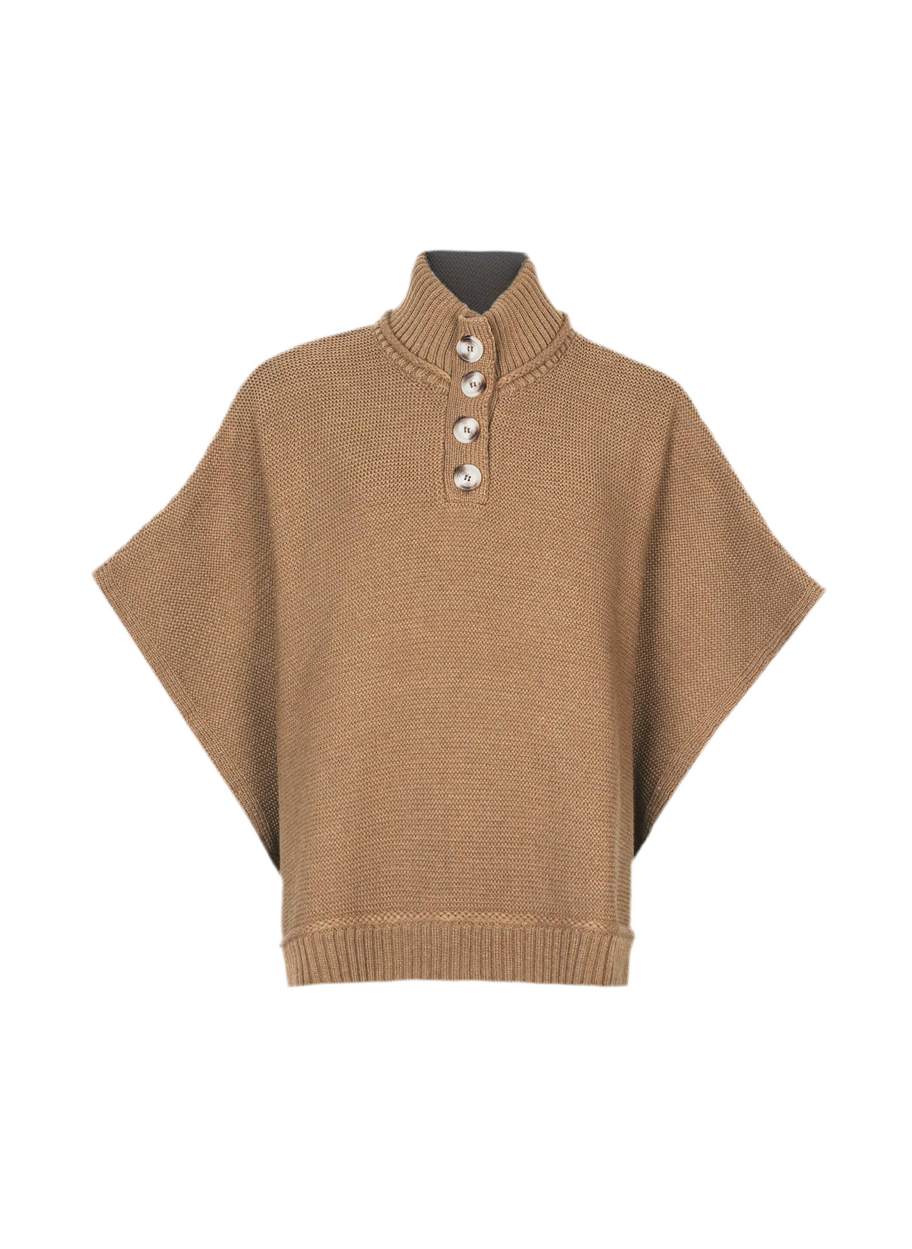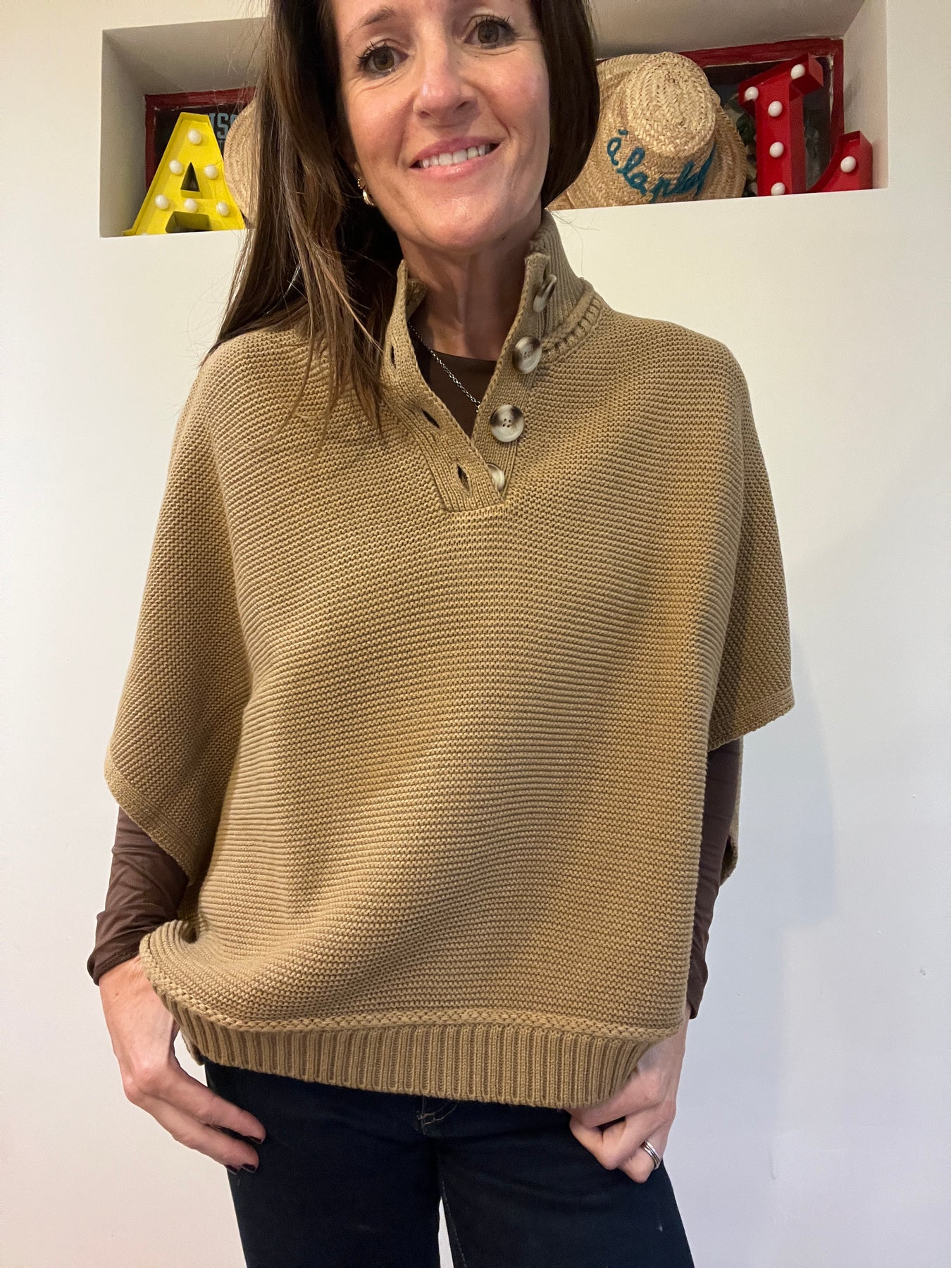 Crafted with a warm, sleeveless knit design and horn effect buttons, this poncho-style jumper offers both comfort and fashion.