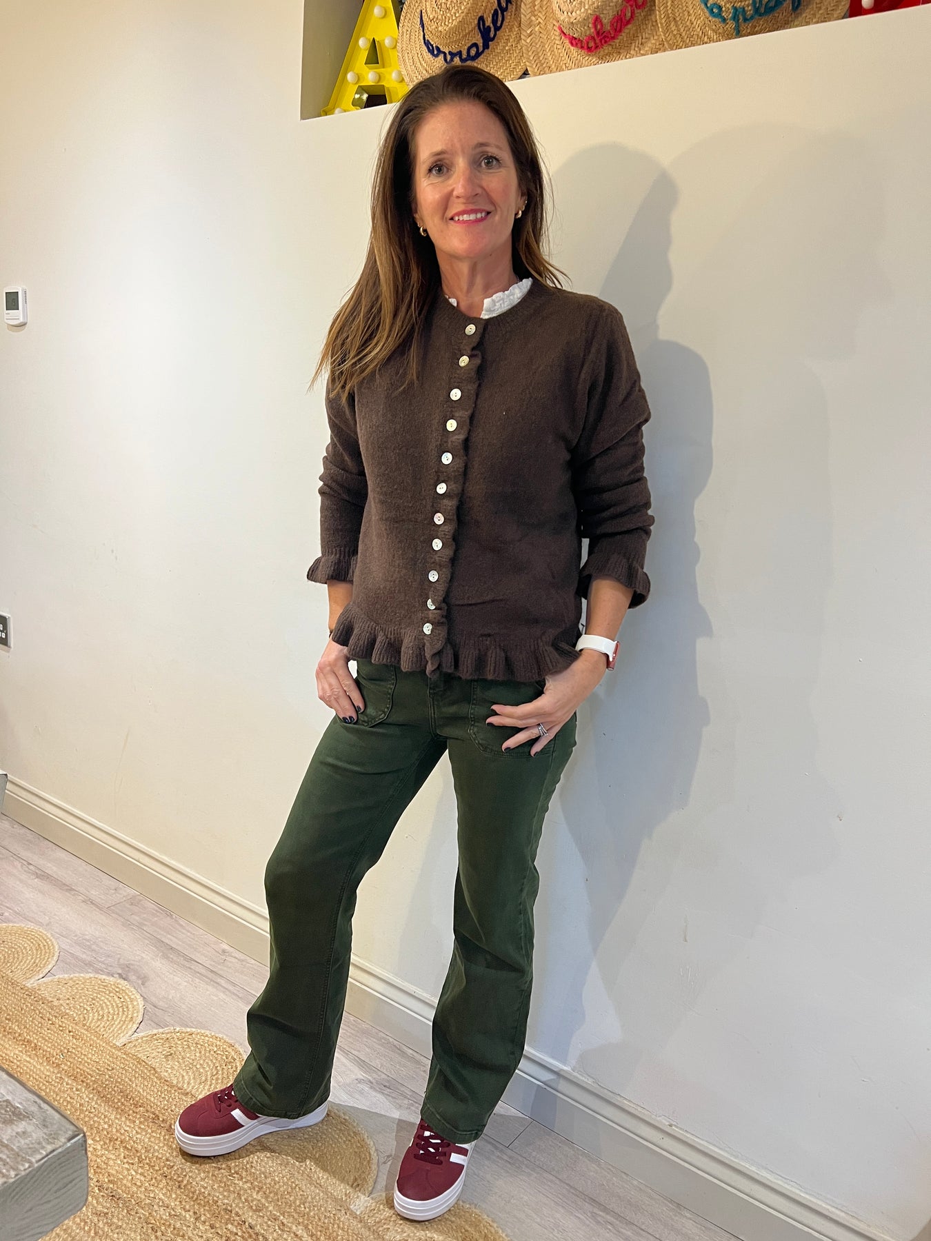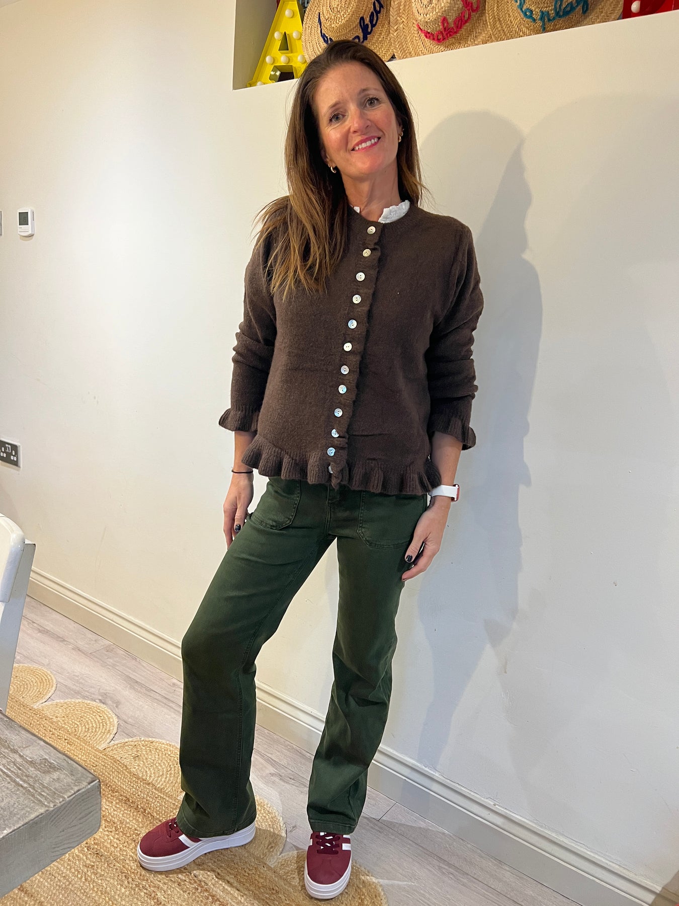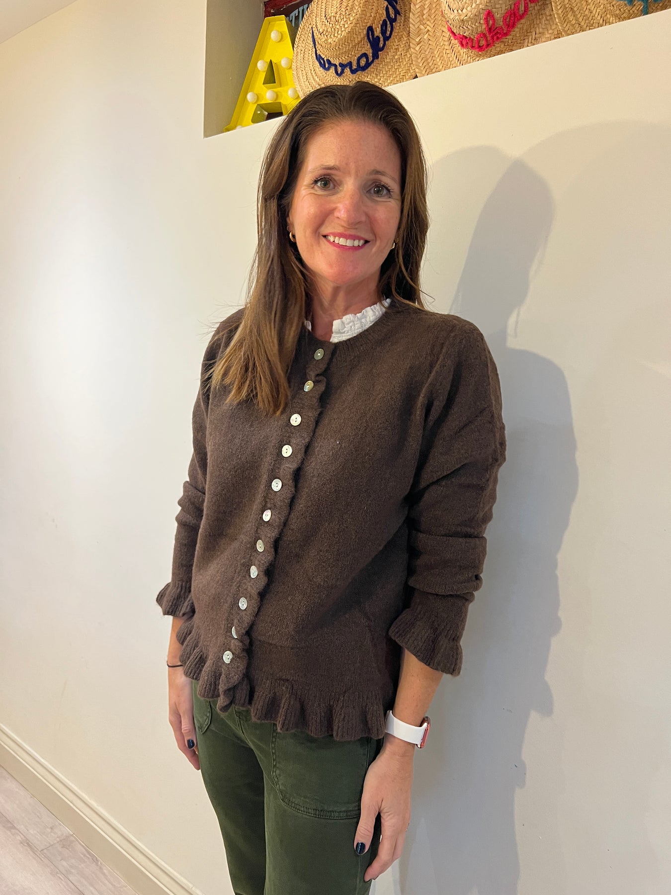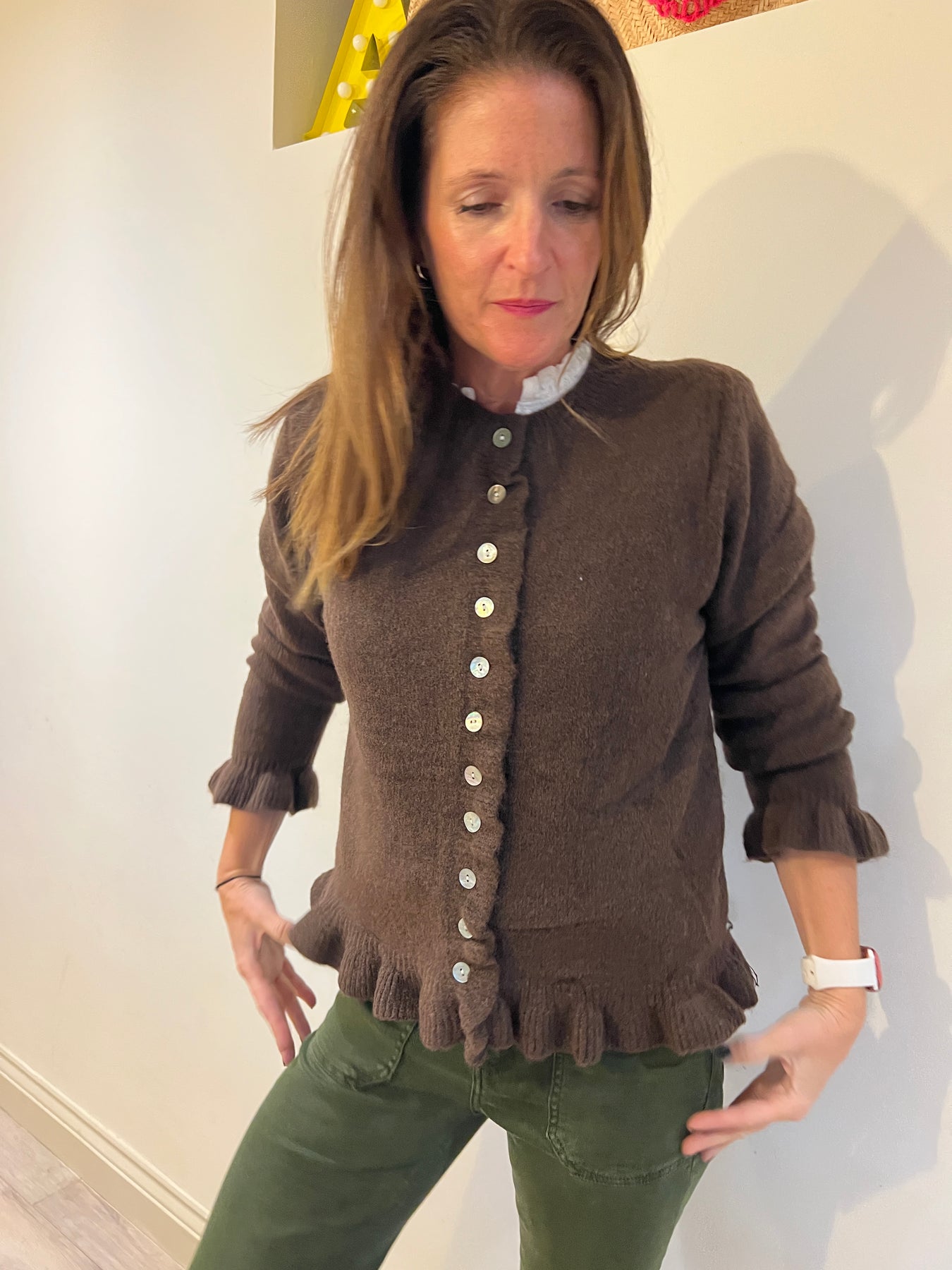 Feminine ruffles on the hem and cuff with small pretty pearl buttons makes this a very wearable attractive cardigan