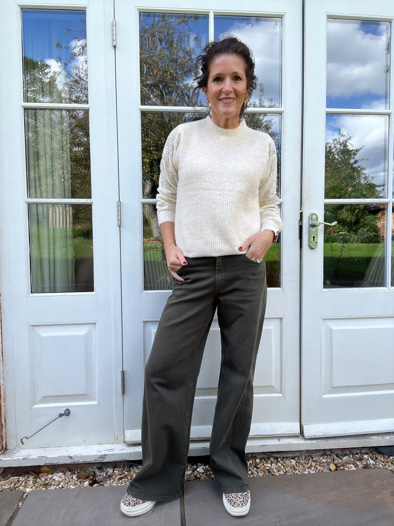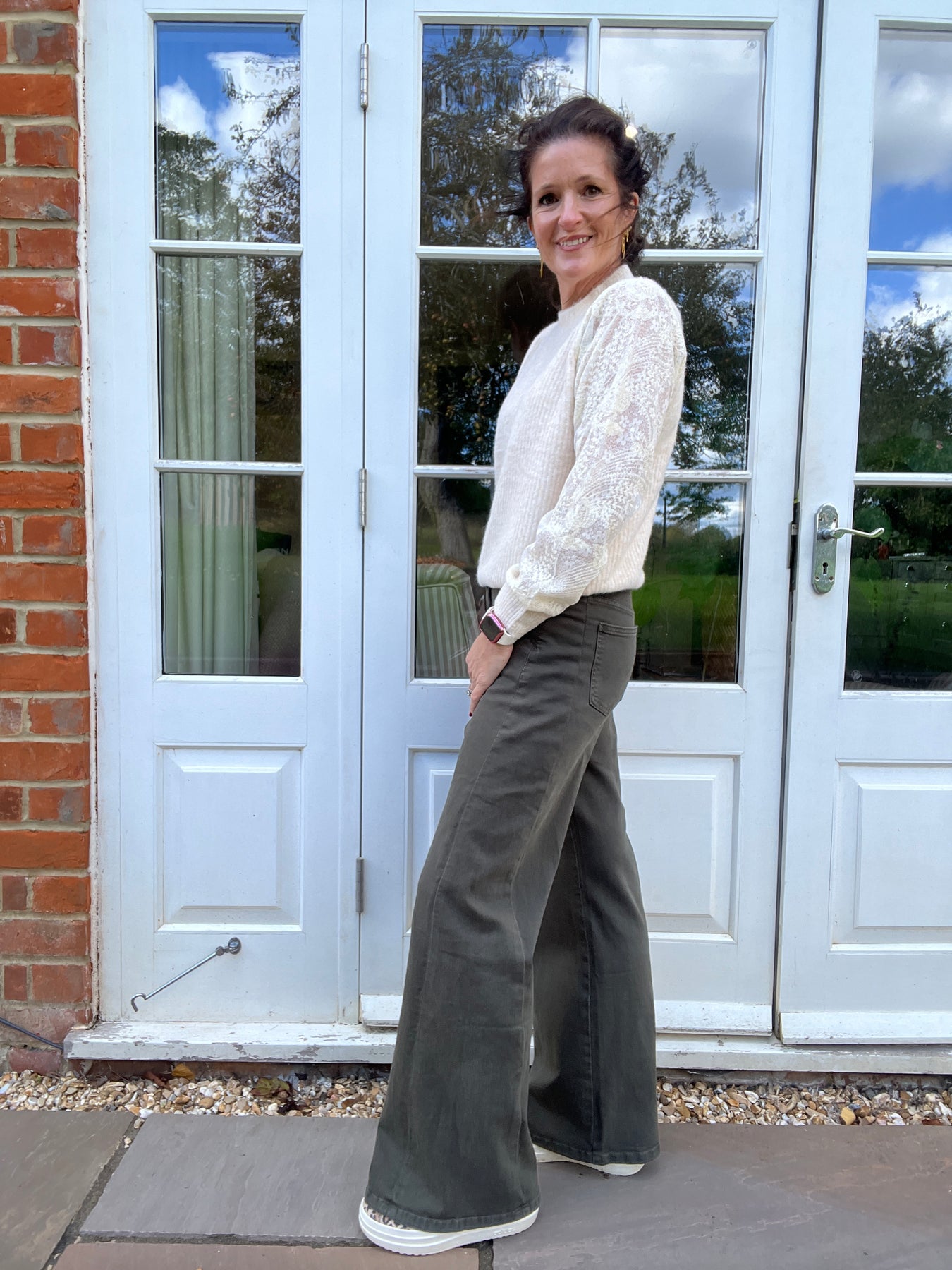 Every day mid rise, wide leg dark khaki jeans with pockets at the back