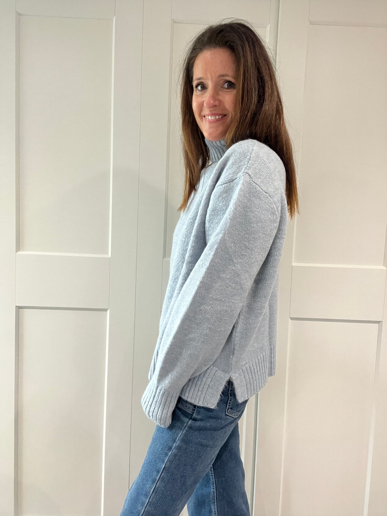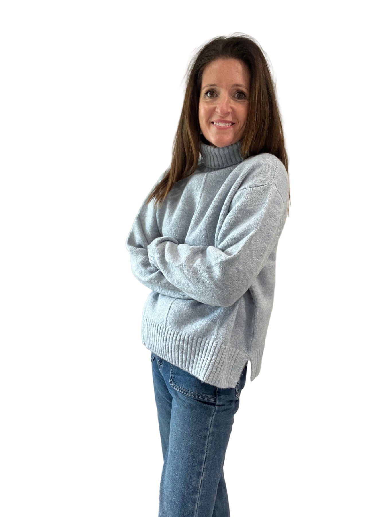 Crafted from jersey knit with a straight cut, this hip-length sweater features a cozy turtleneck, long sleeves, and refined knit details.