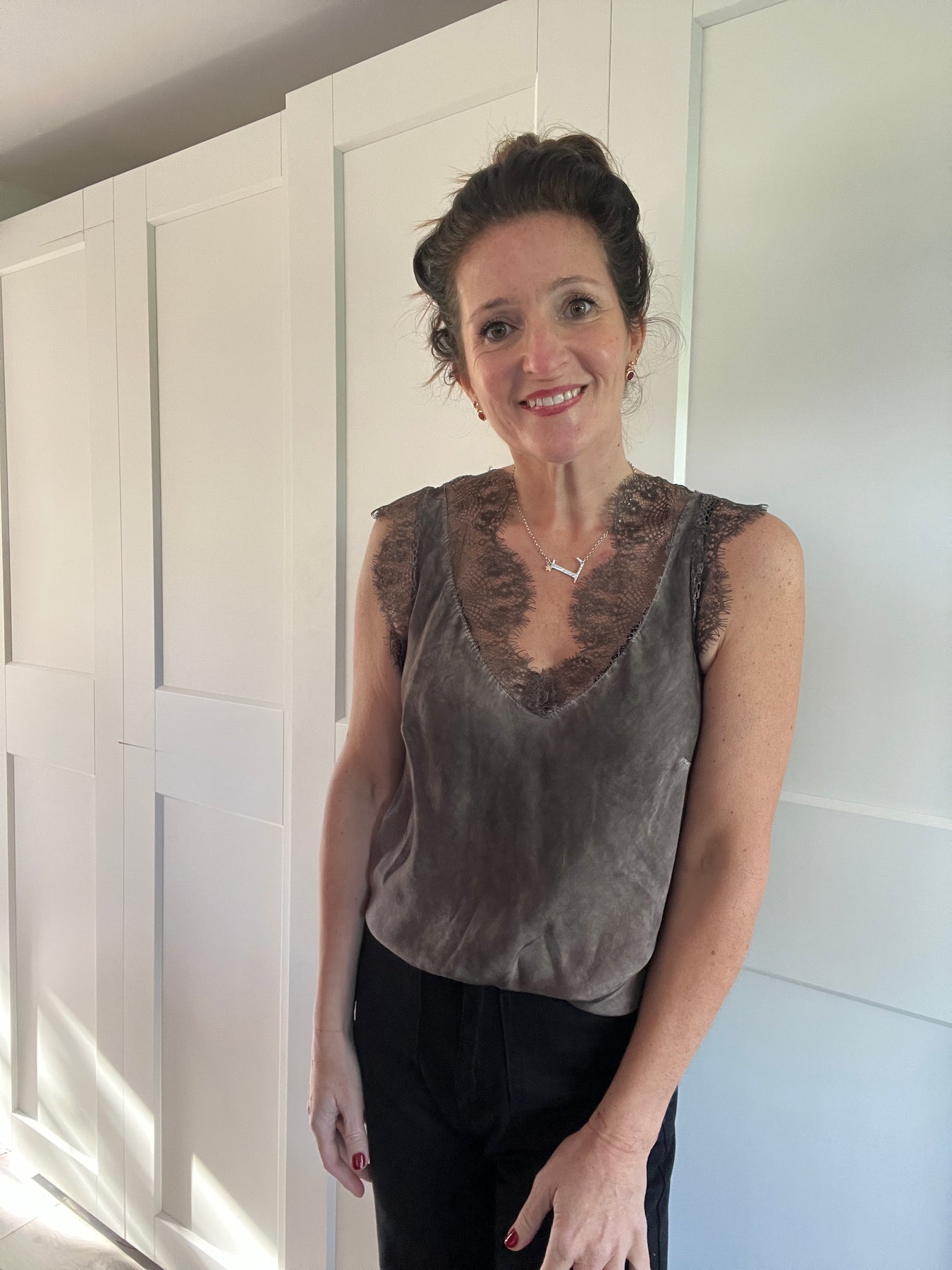 A gorgeous camisole with thick strap and lace either side so you don’t see your bra!