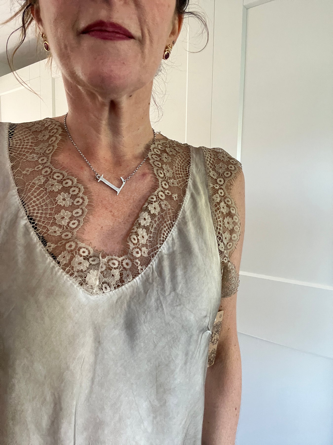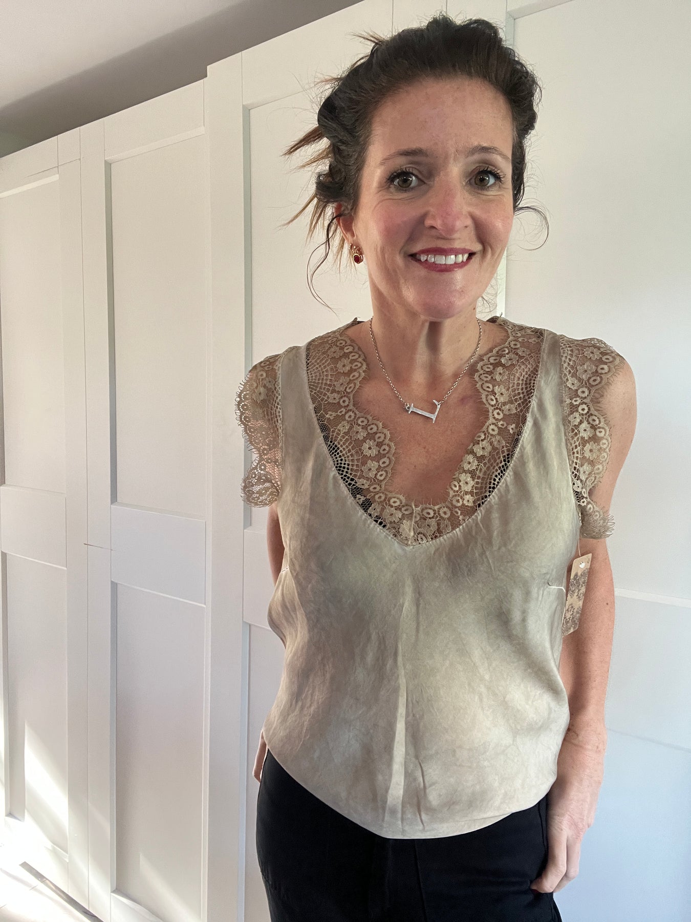 A gorgeous camisole with thick strap and lace either side so you don’t see your bra!
