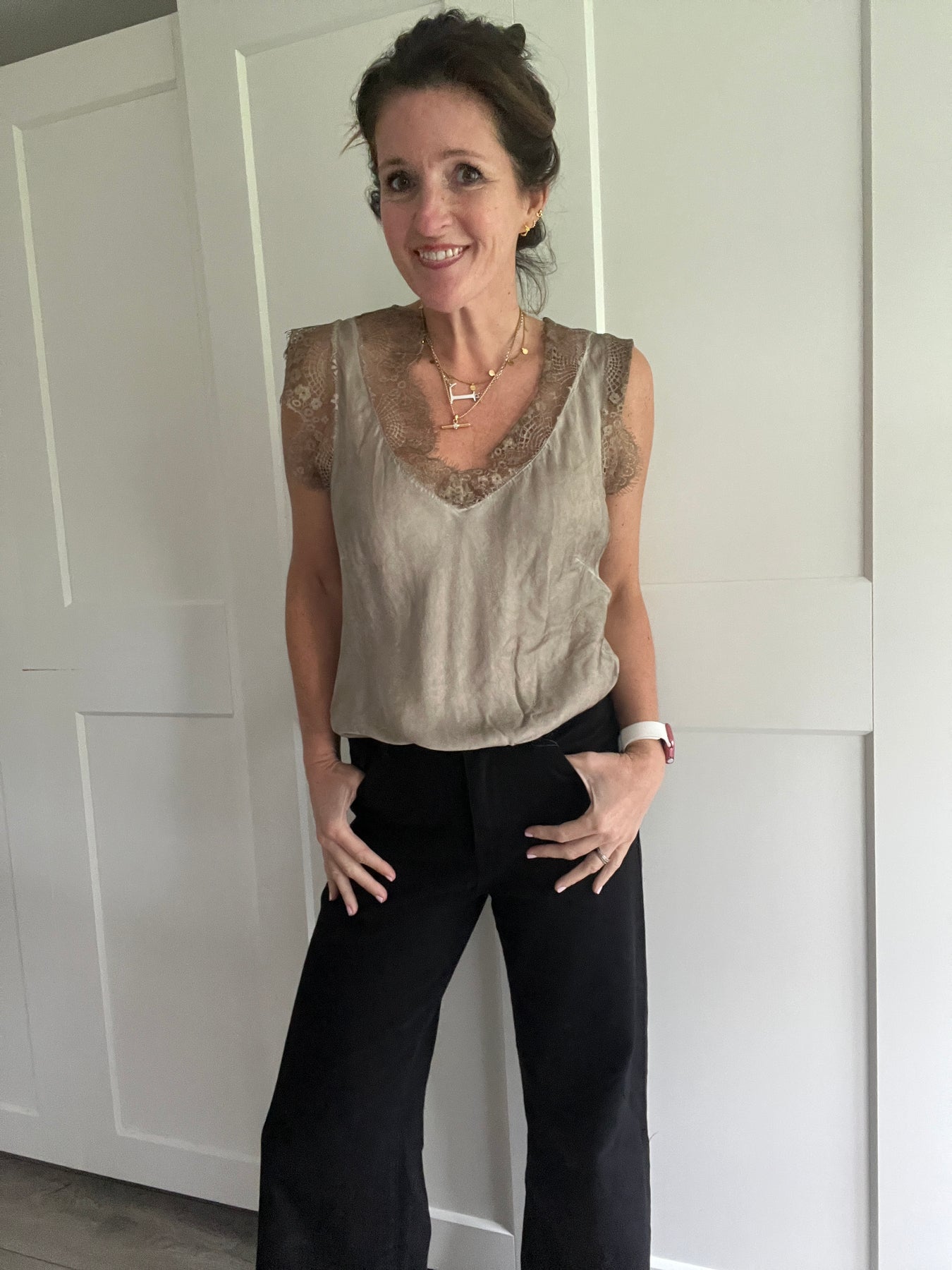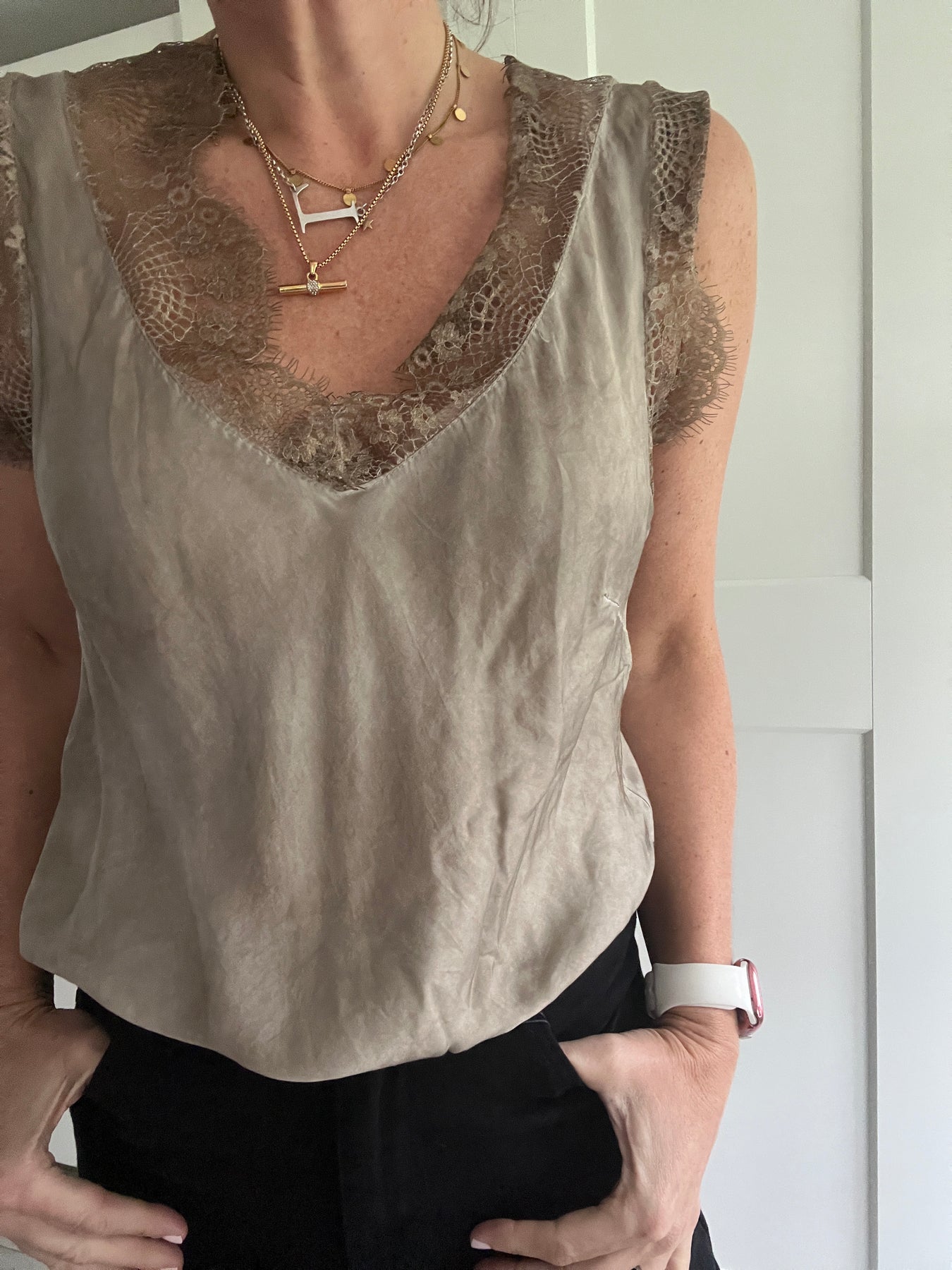 A gorgeous camisole with thick strap and lace either side so you don’t see your bra!