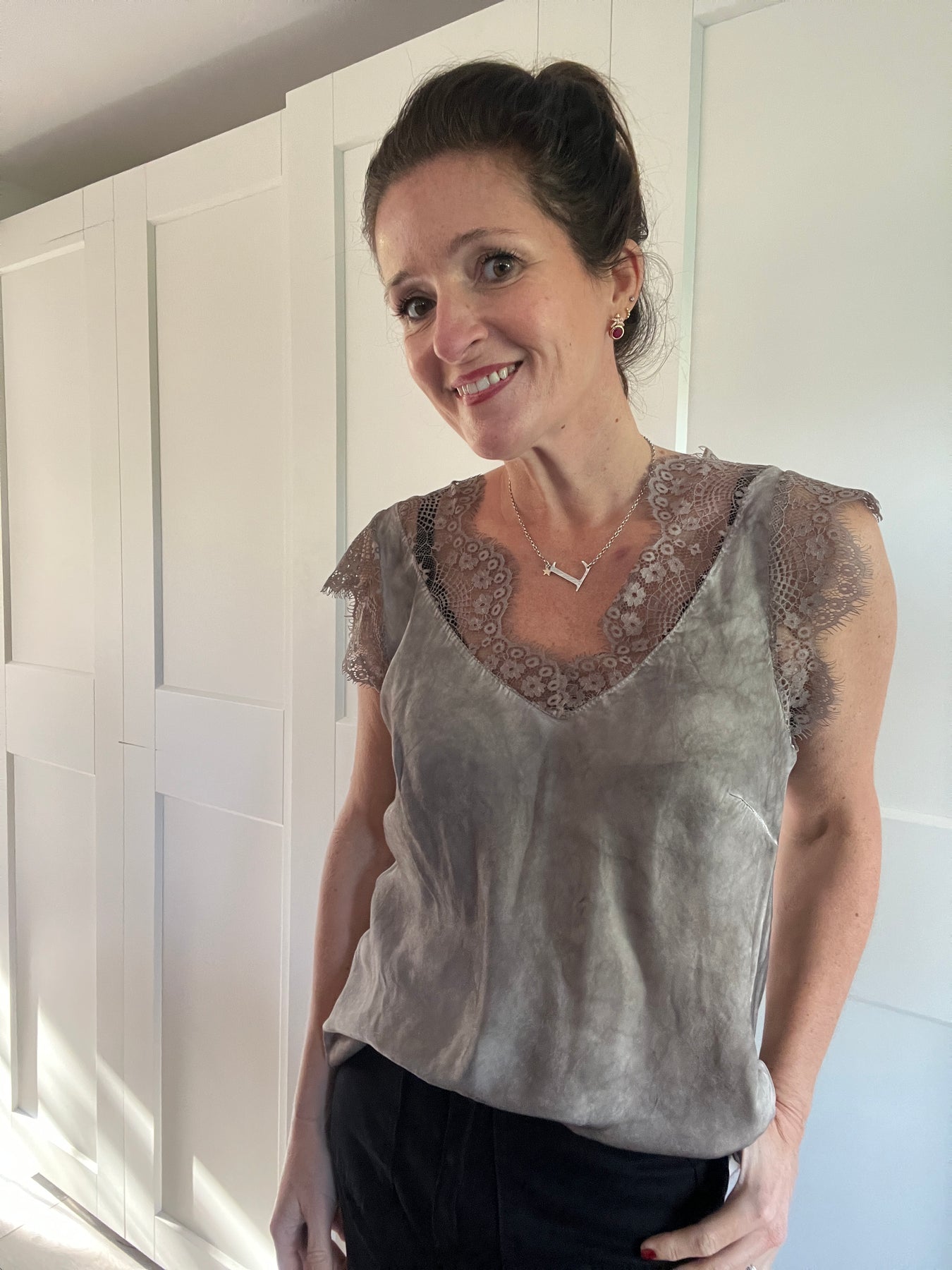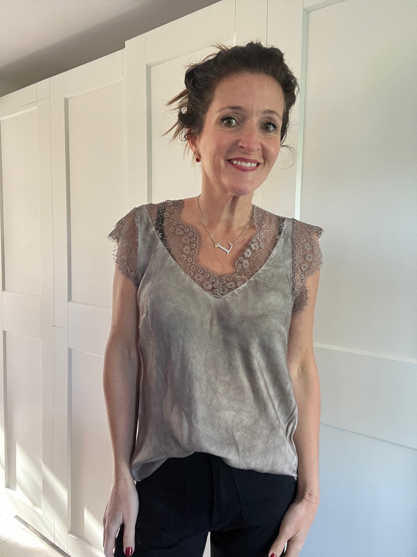 A gorgeous camisole with thick strap and lace either side so you don’t see your bra!