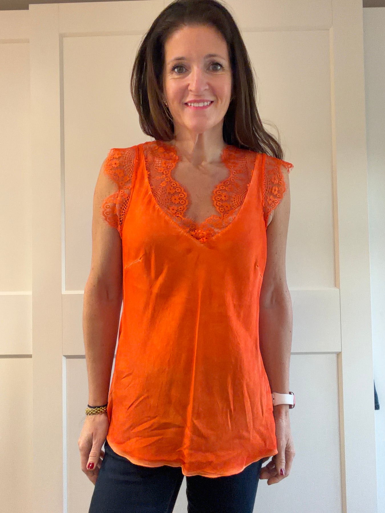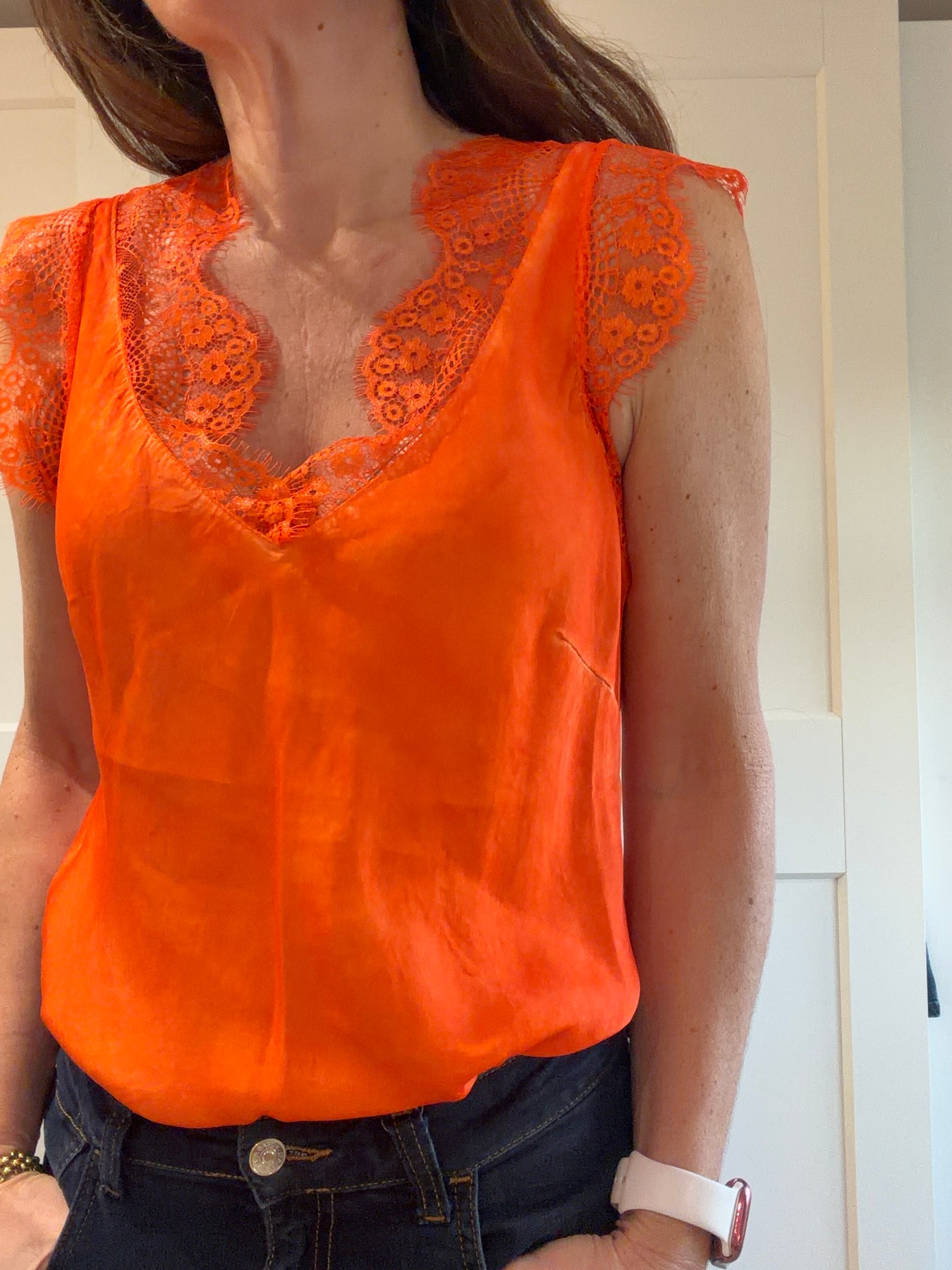 A gorgeous camisole with thick strap and lace either side so you don’t see your bra!