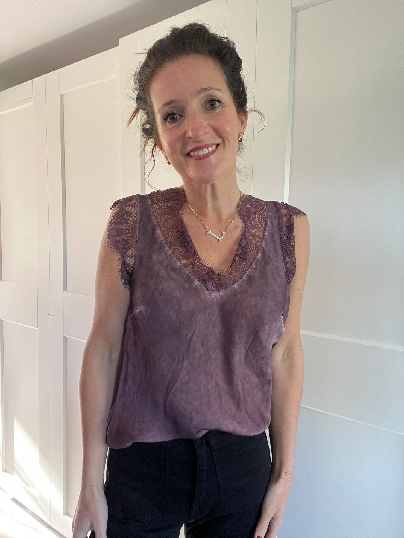 A gorgeous camisole with thick strap and lace either side so you don’t see your bra!