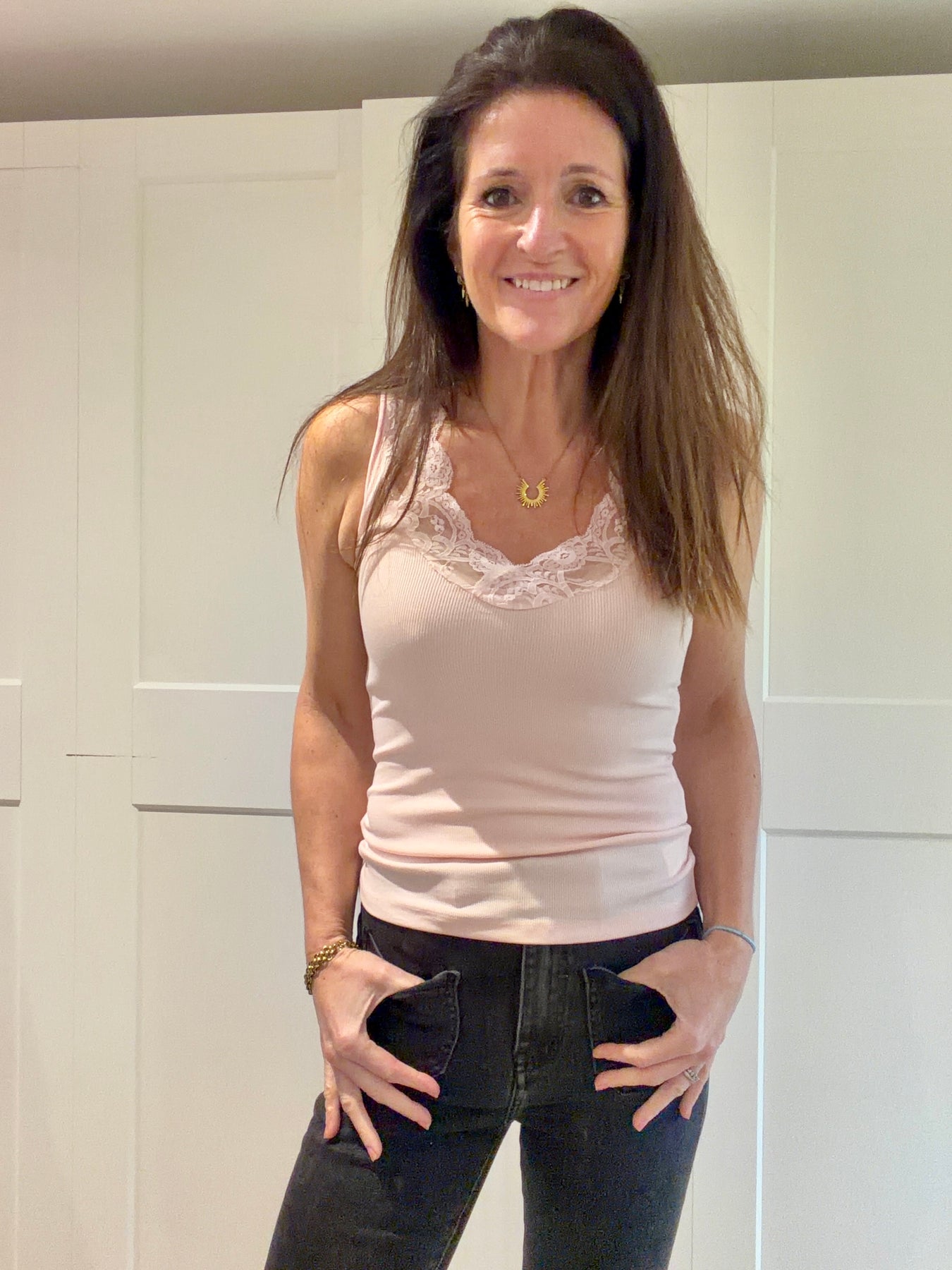 A useful v neck stretchy layering vest to be worn on its own or underneath a jumper or cardigan. I’m even wearing it for exercise as it doesn’t ride up when I’m doing my downward dog!