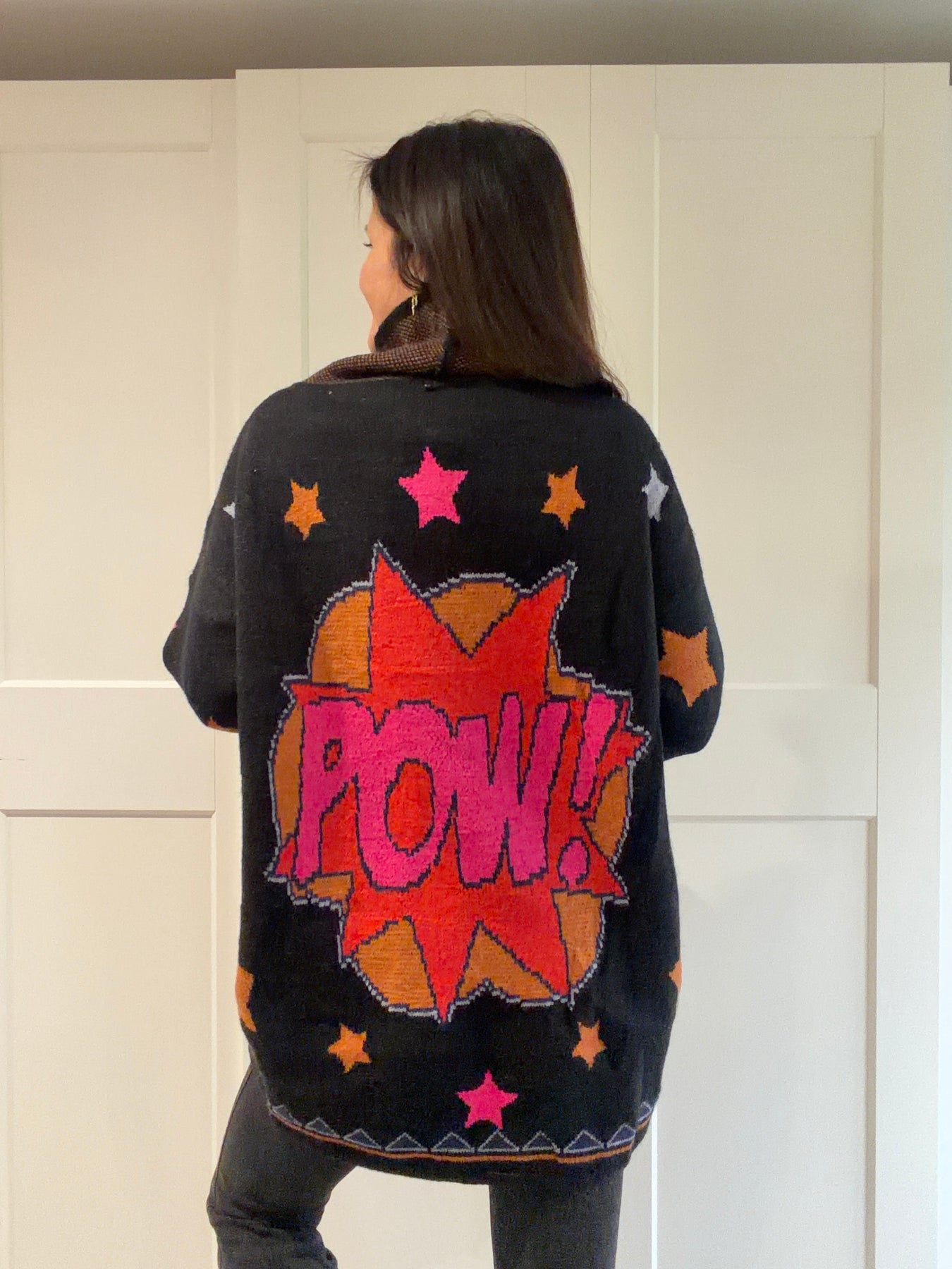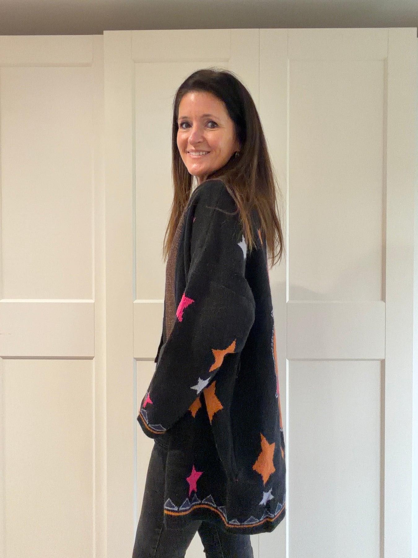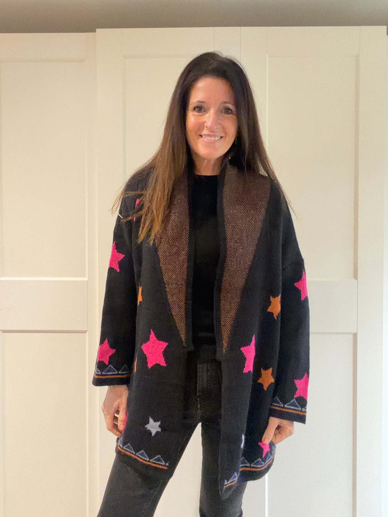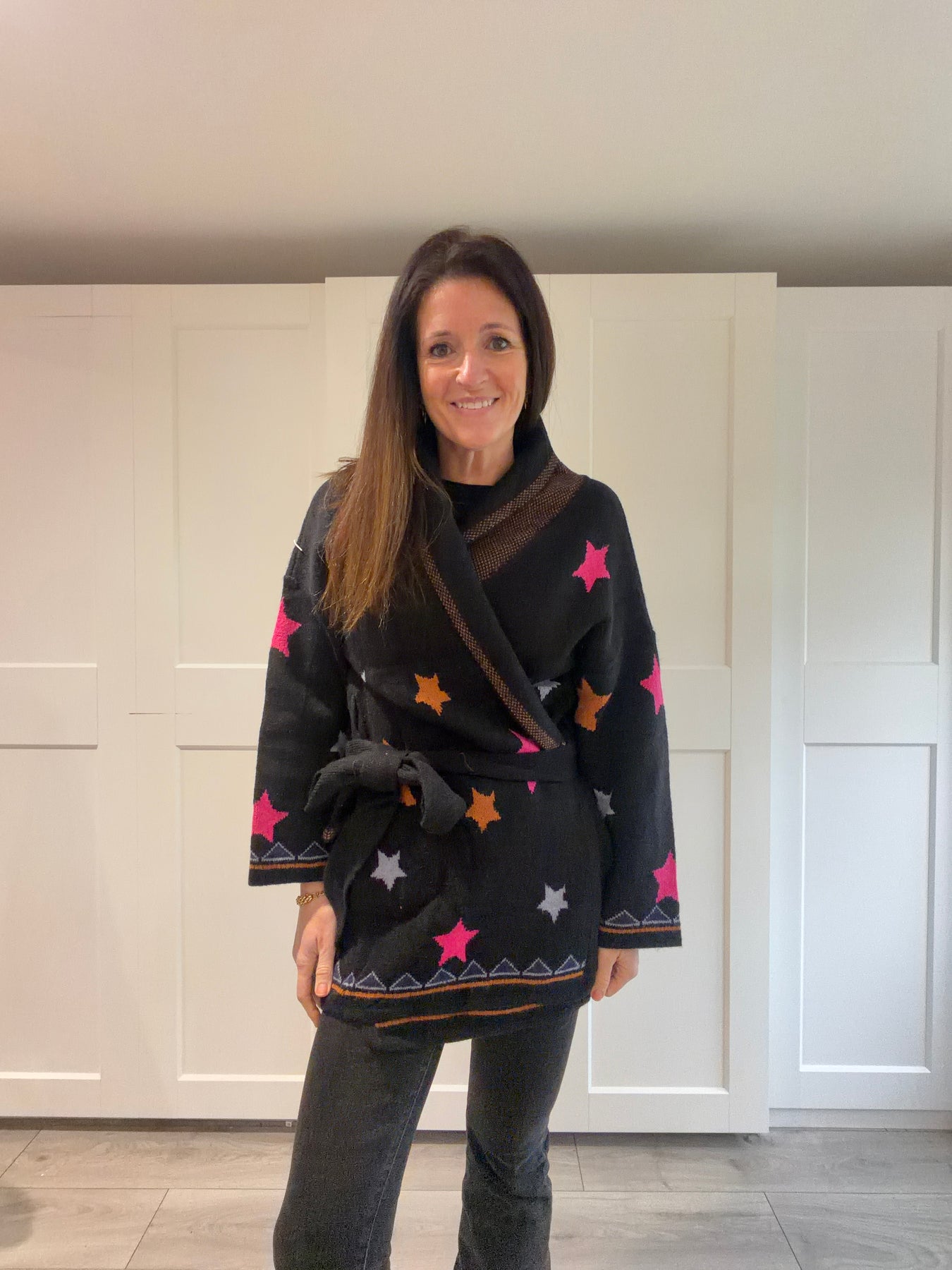 Add a touch of whimsy to your outfits with this long cardigan in soft knit, adorned with colorful stars. Its oversized fit and tone-on-tone belt offer comfort and style. Perfect for lounging or casual wear.