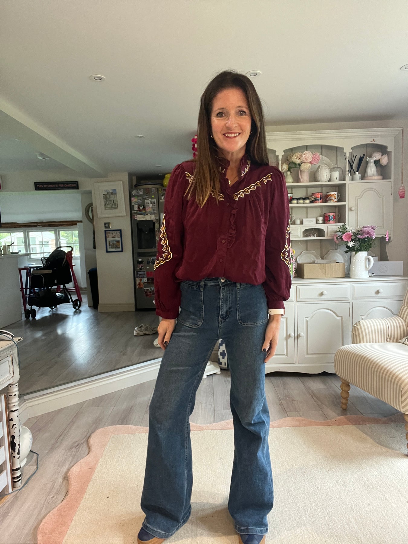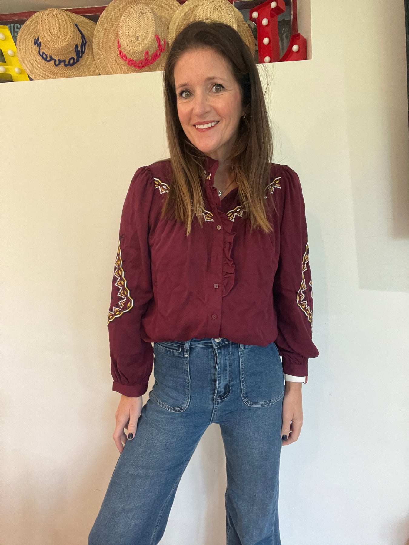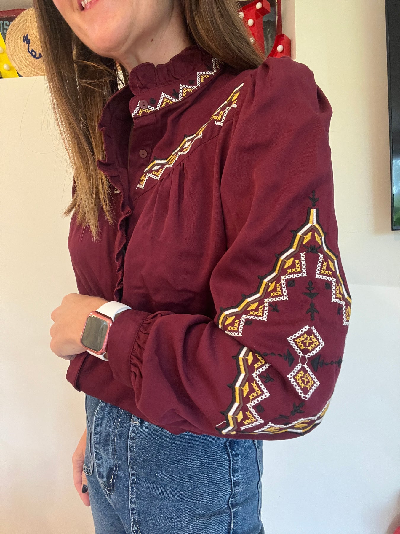Stunning embroidered detail on arms & chest with a flattering neckline with the upright collar neckline - a gorgeous blouse with sUre to turn heads