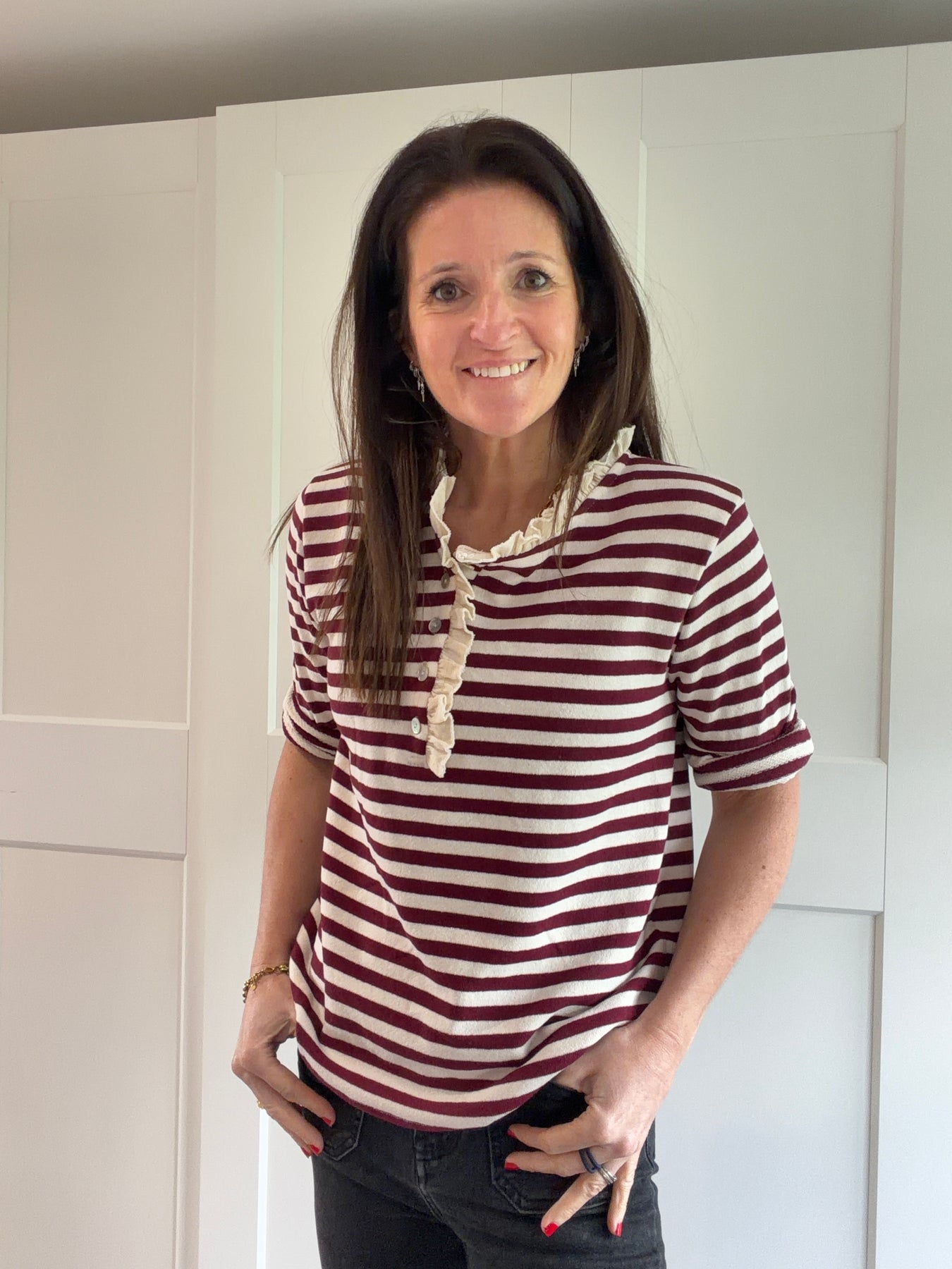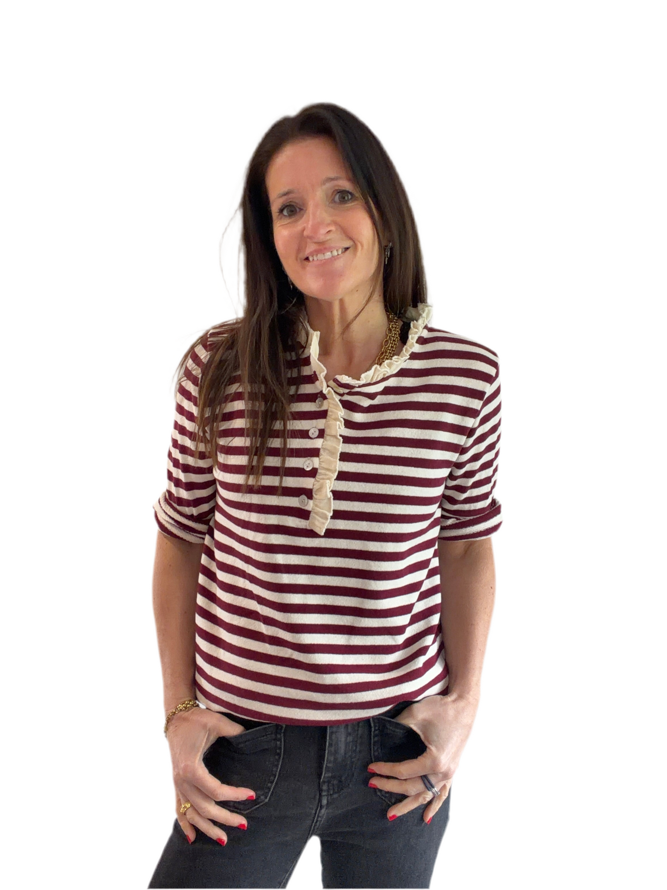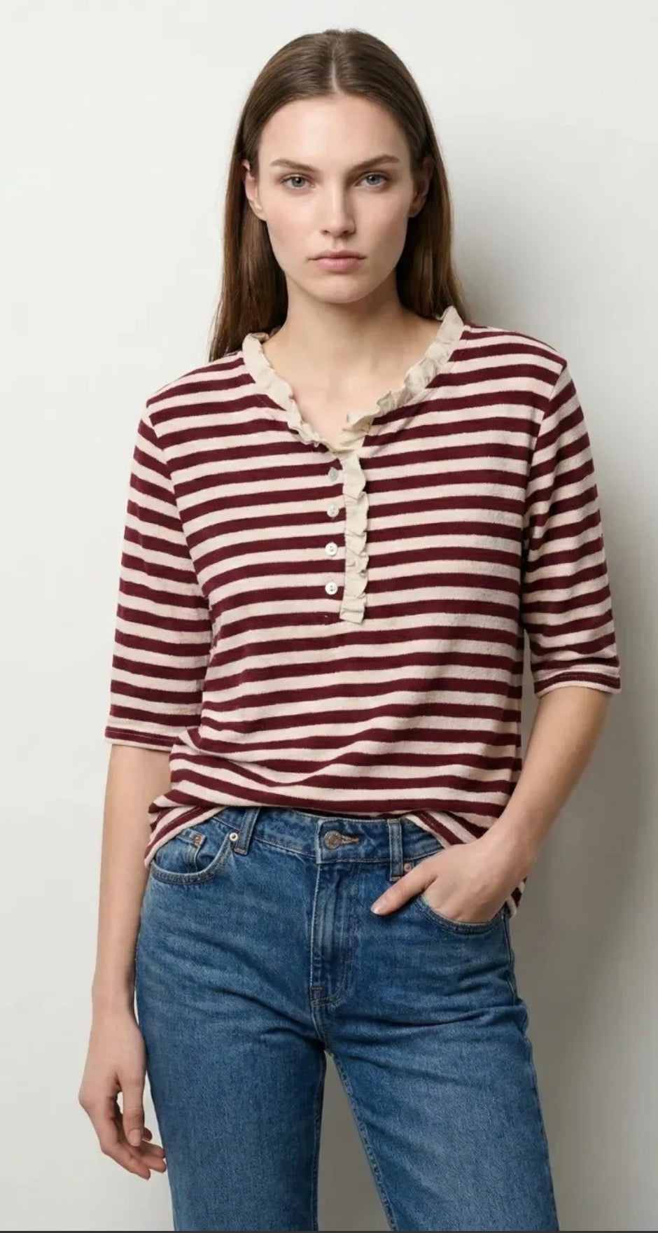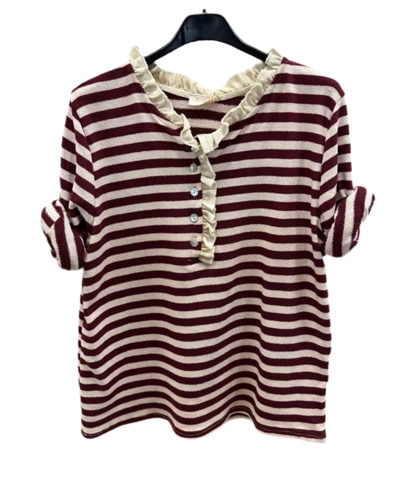 Nautical style with horizontal stripes, buttoned Henley collar adorned with a feminine ruffled finish, long sleeves.