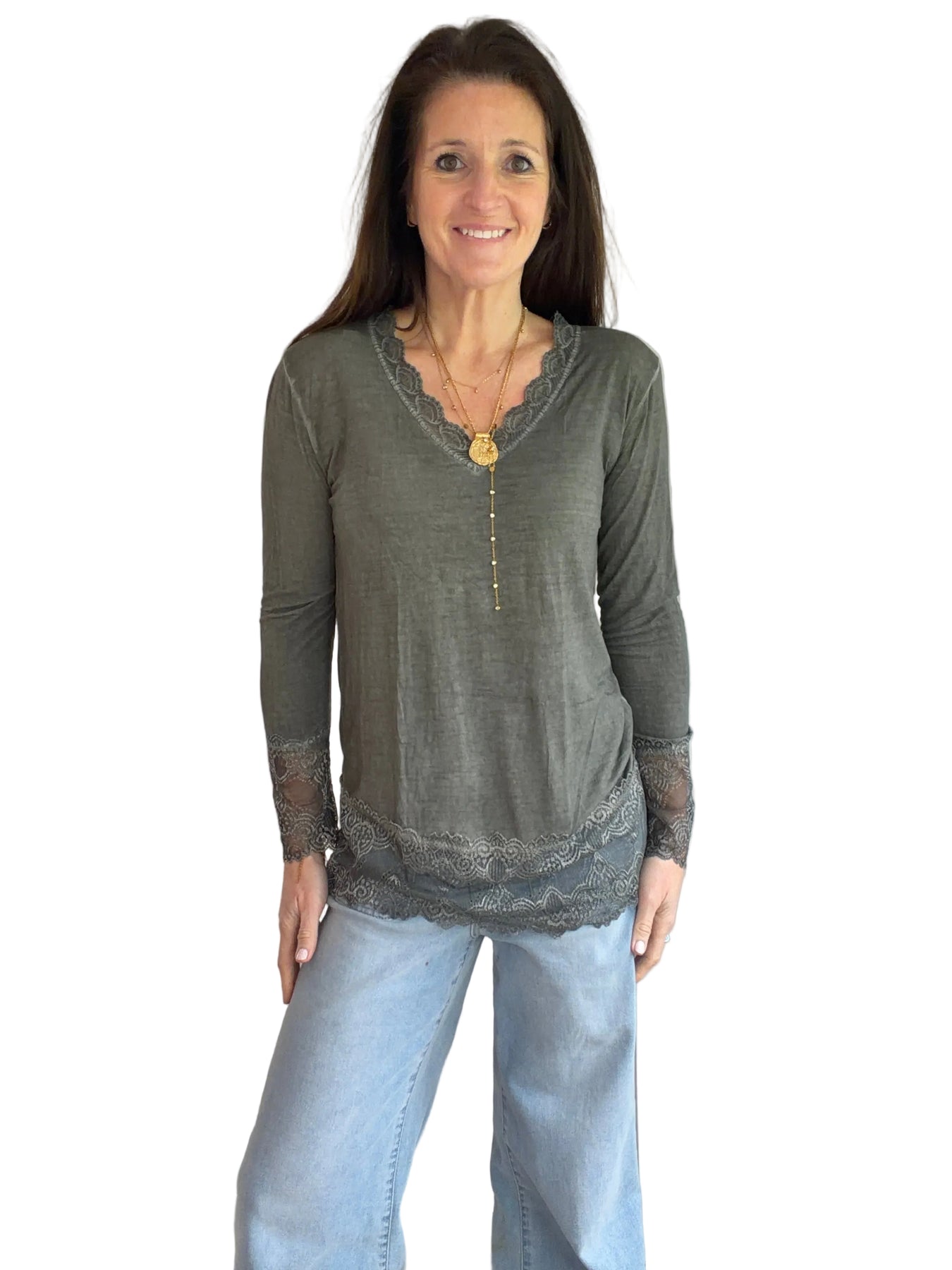 A very useful layering t shirt with lace edge v neck, cuffs and hem. Perfect under tanks and jumpers to add an extra layer of interest. Super soft and stretchy and feels lovely against the skin