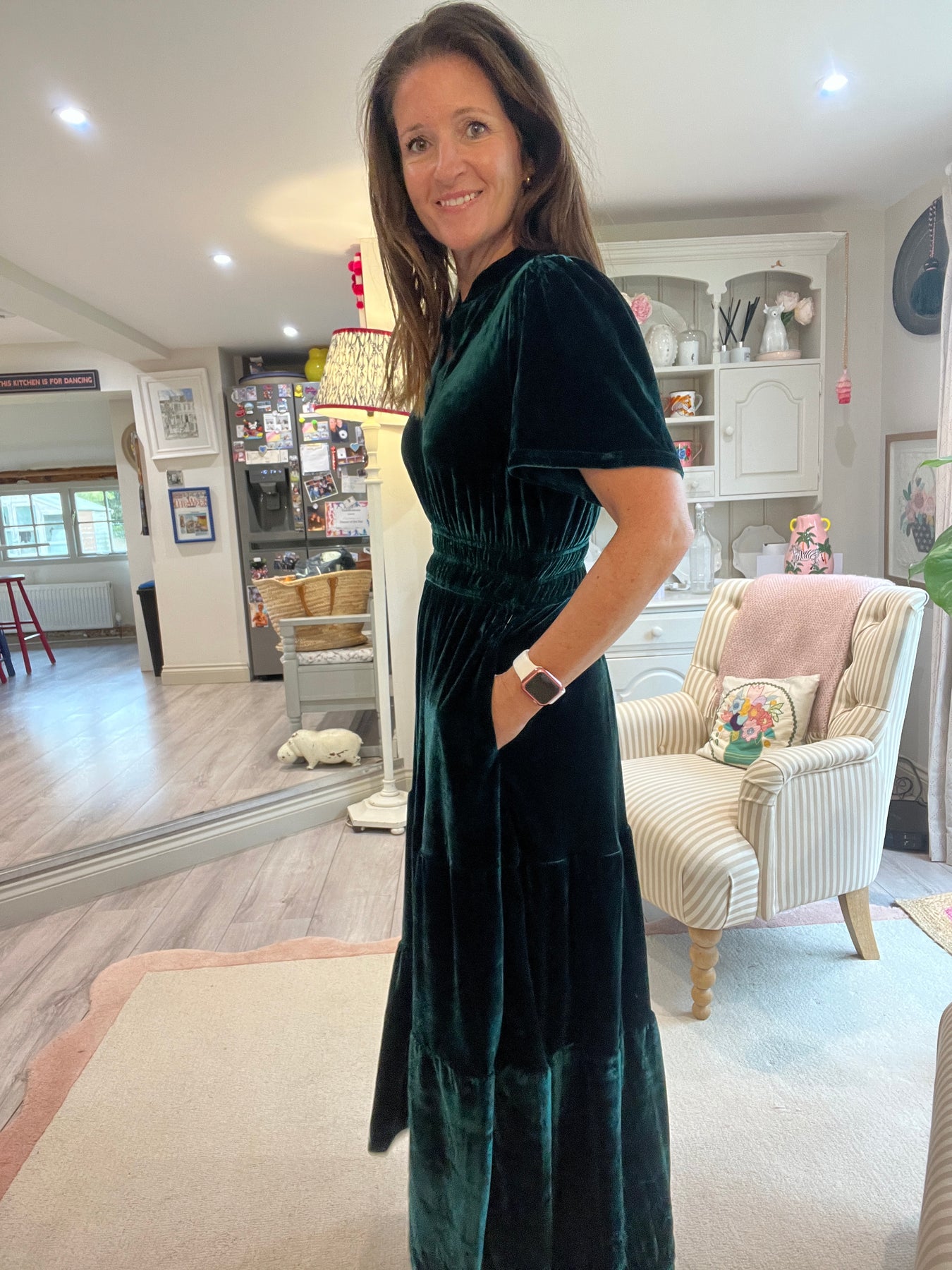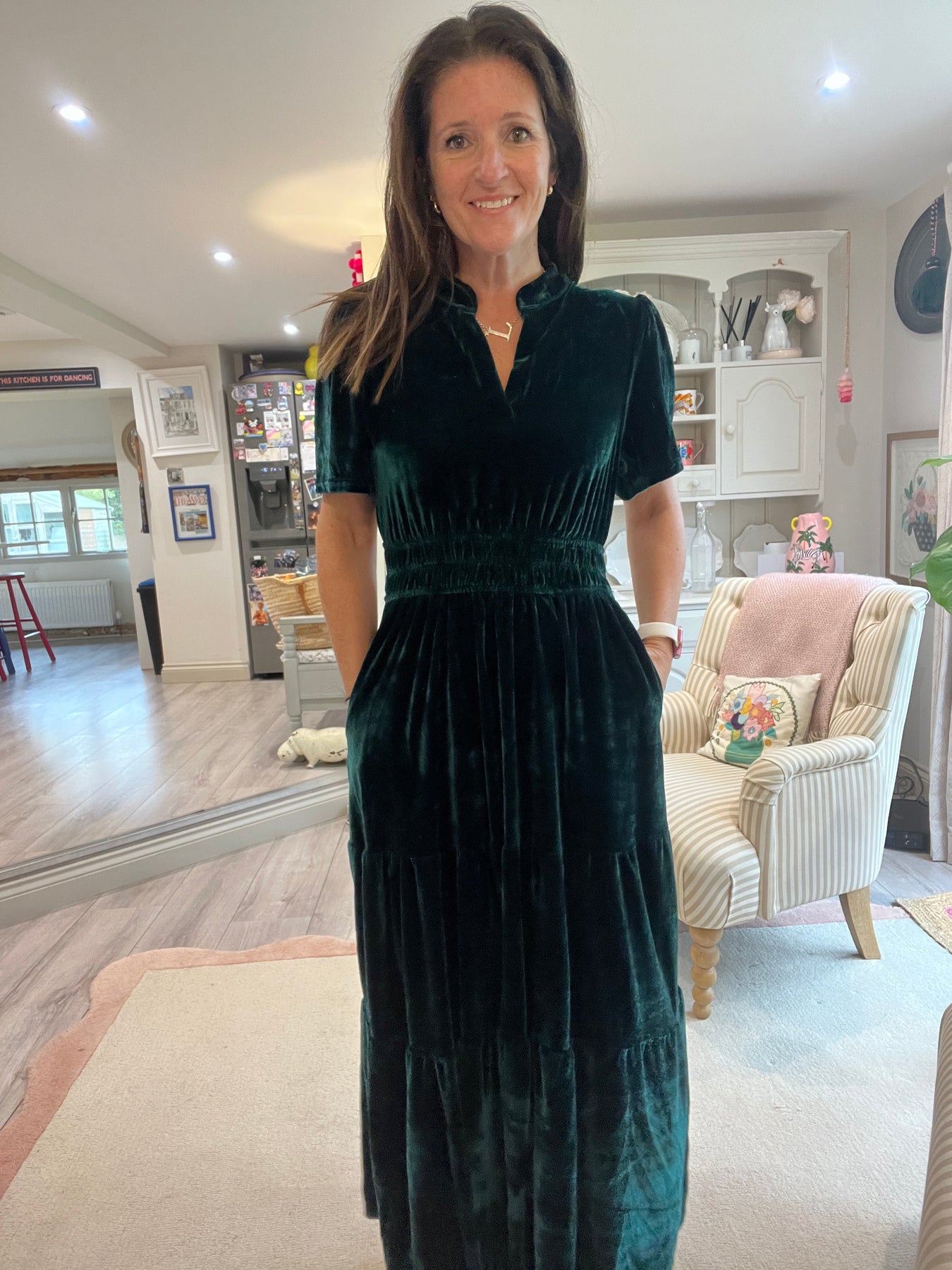 This gorgeous short sleeve navy tiered maxi dress is perfect Christmas Day or a Christmas party