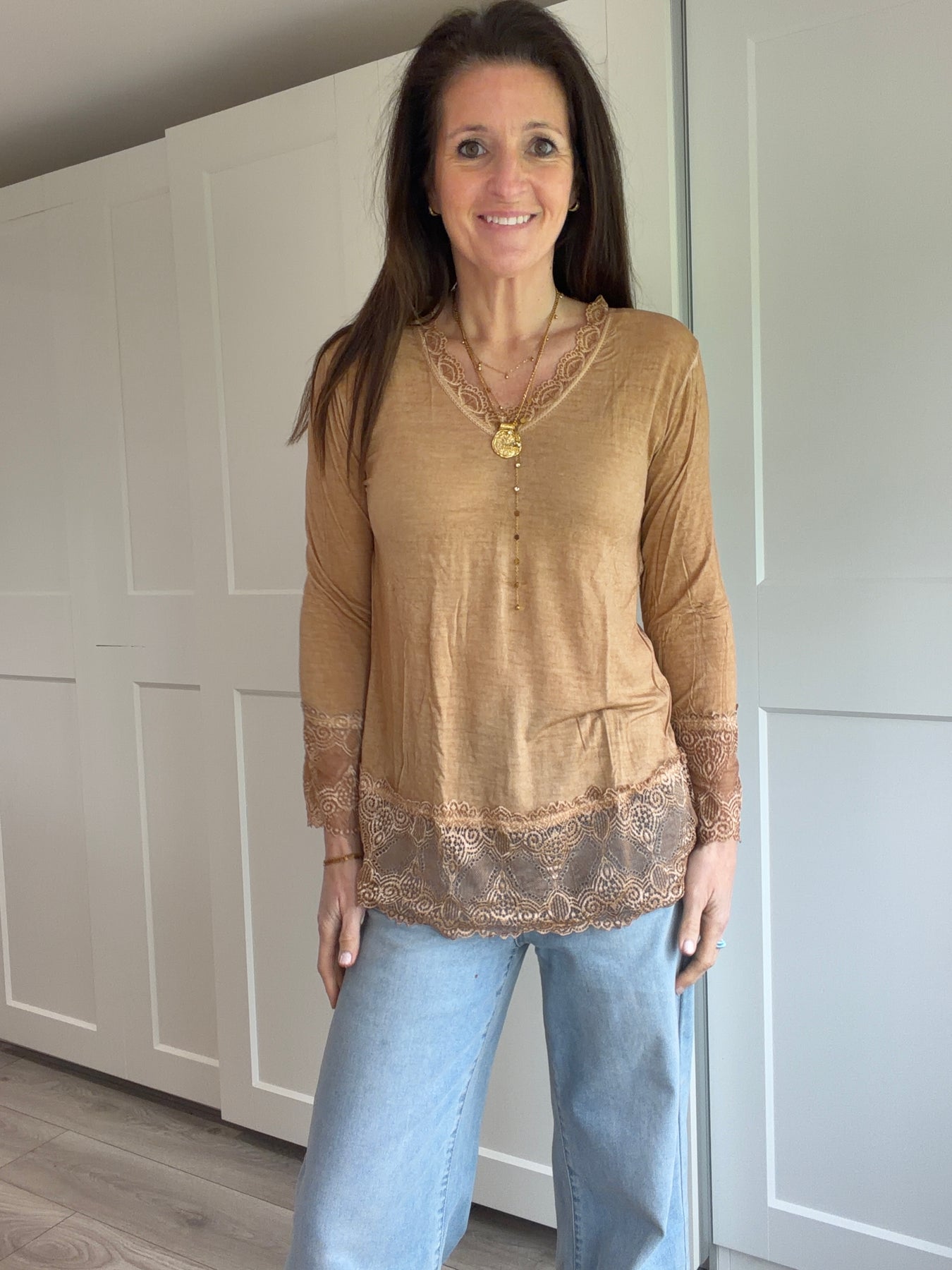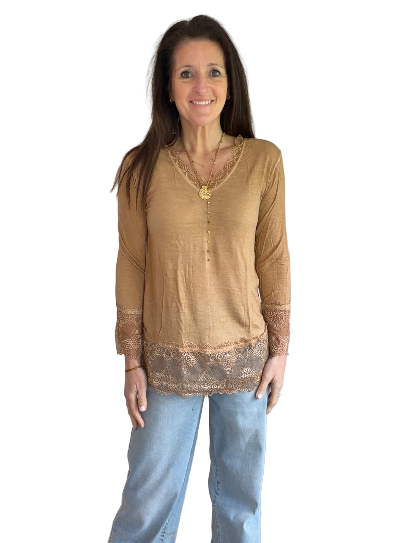 V Neck Lace Edge Camel Long Sleeve Layering Top