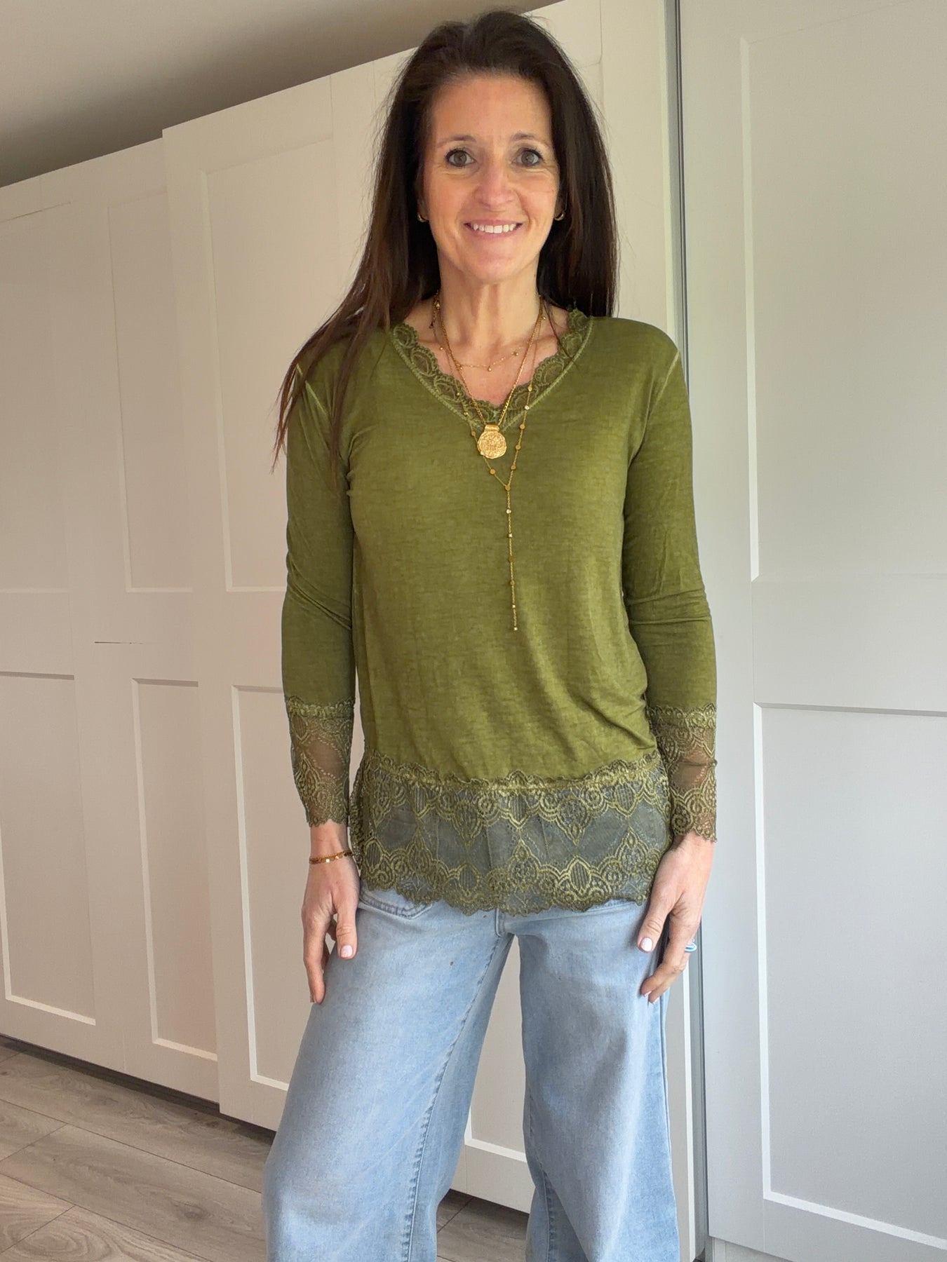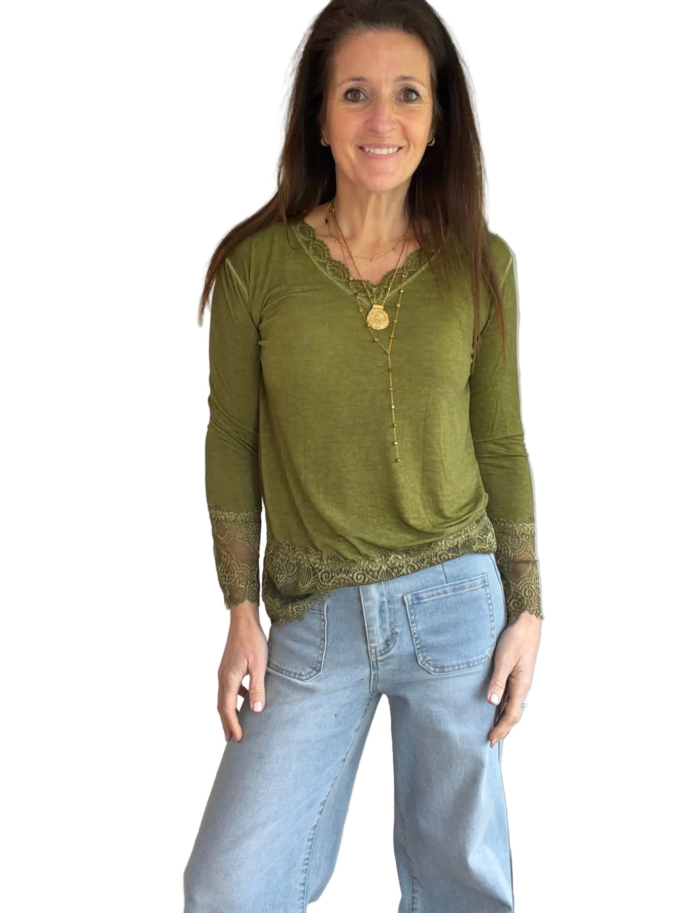 V Neck Lace Edge Olive Long Sleeve Layering Top