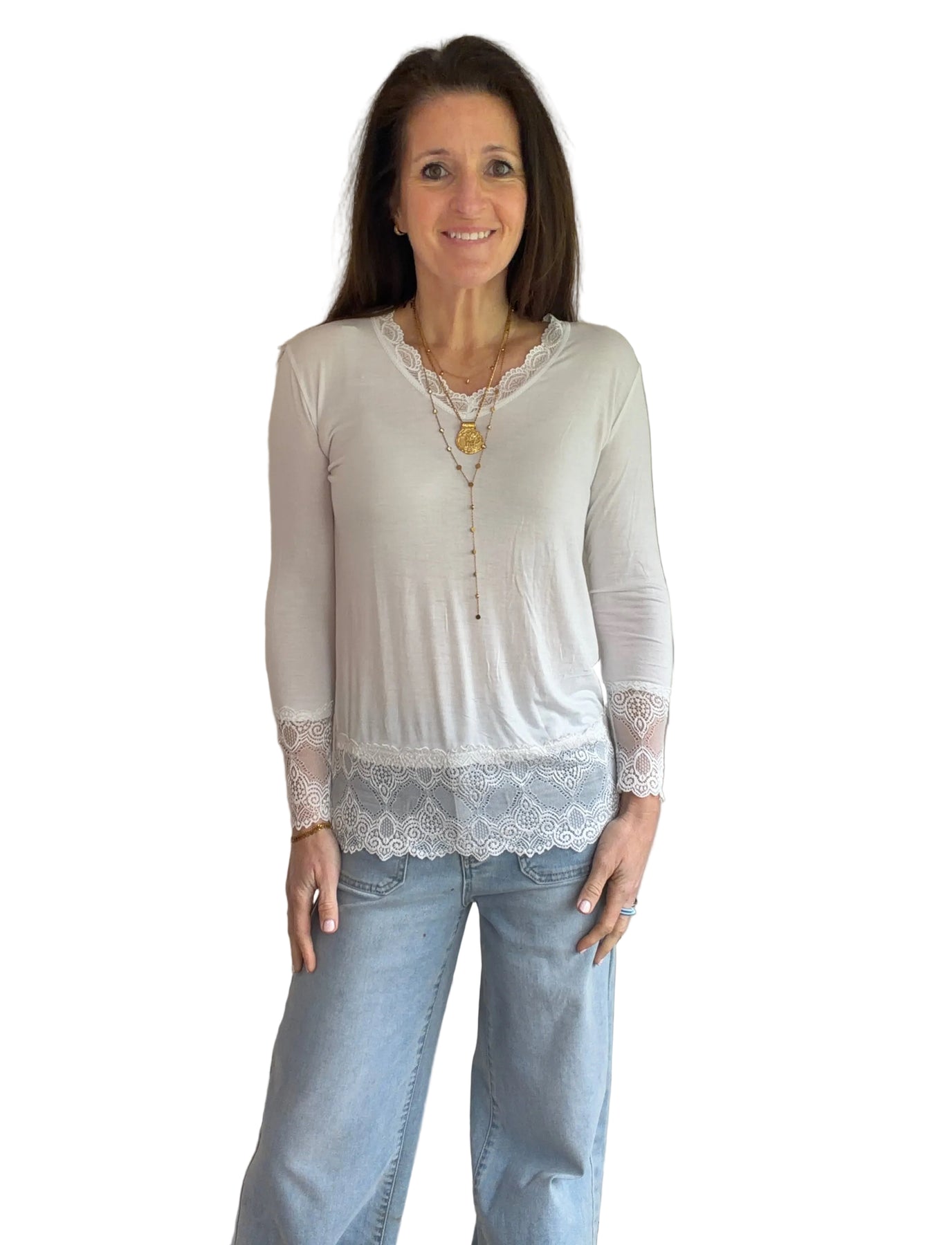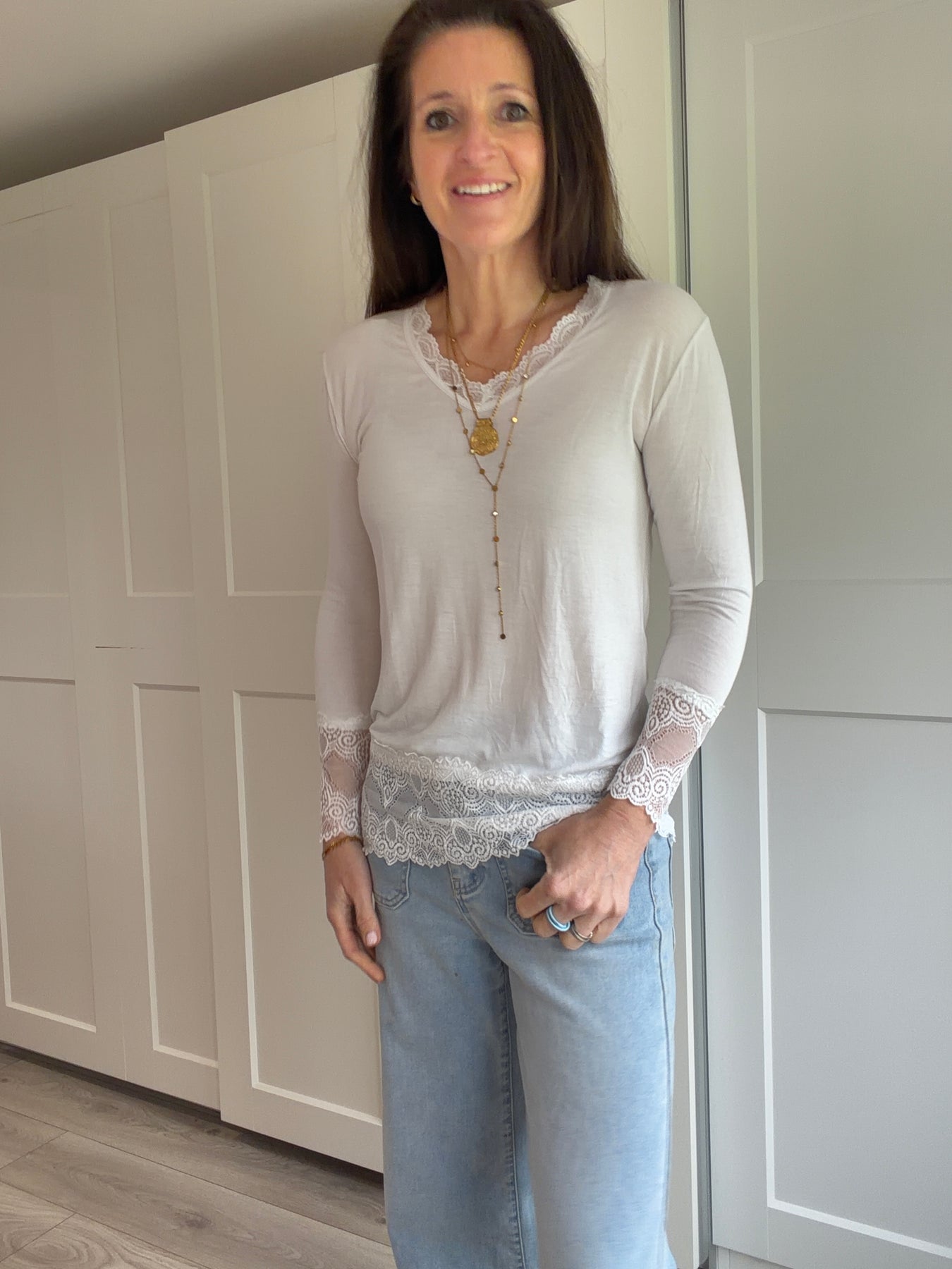 A very useful layering t shirt with lace edge v neck, cuffs and hem. Perfect under tanks and jumpers to add an extra layer of interest. Super soft and stretchy and feels lovely against the skin