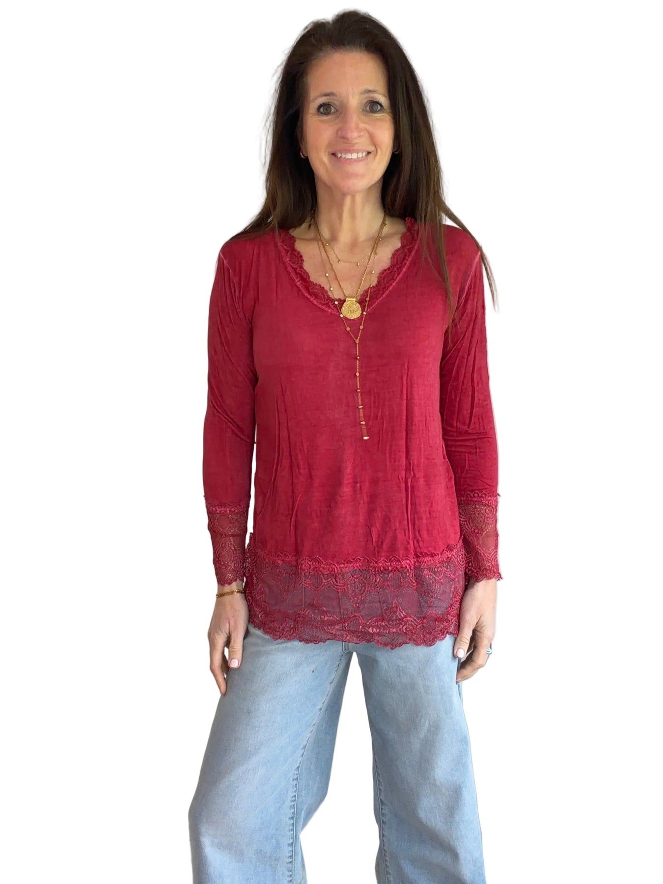 V Neck Lace Edge Wine Long Sleeve Layering Top