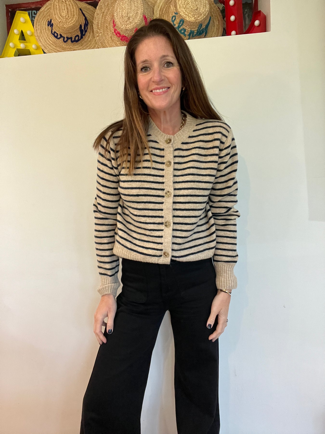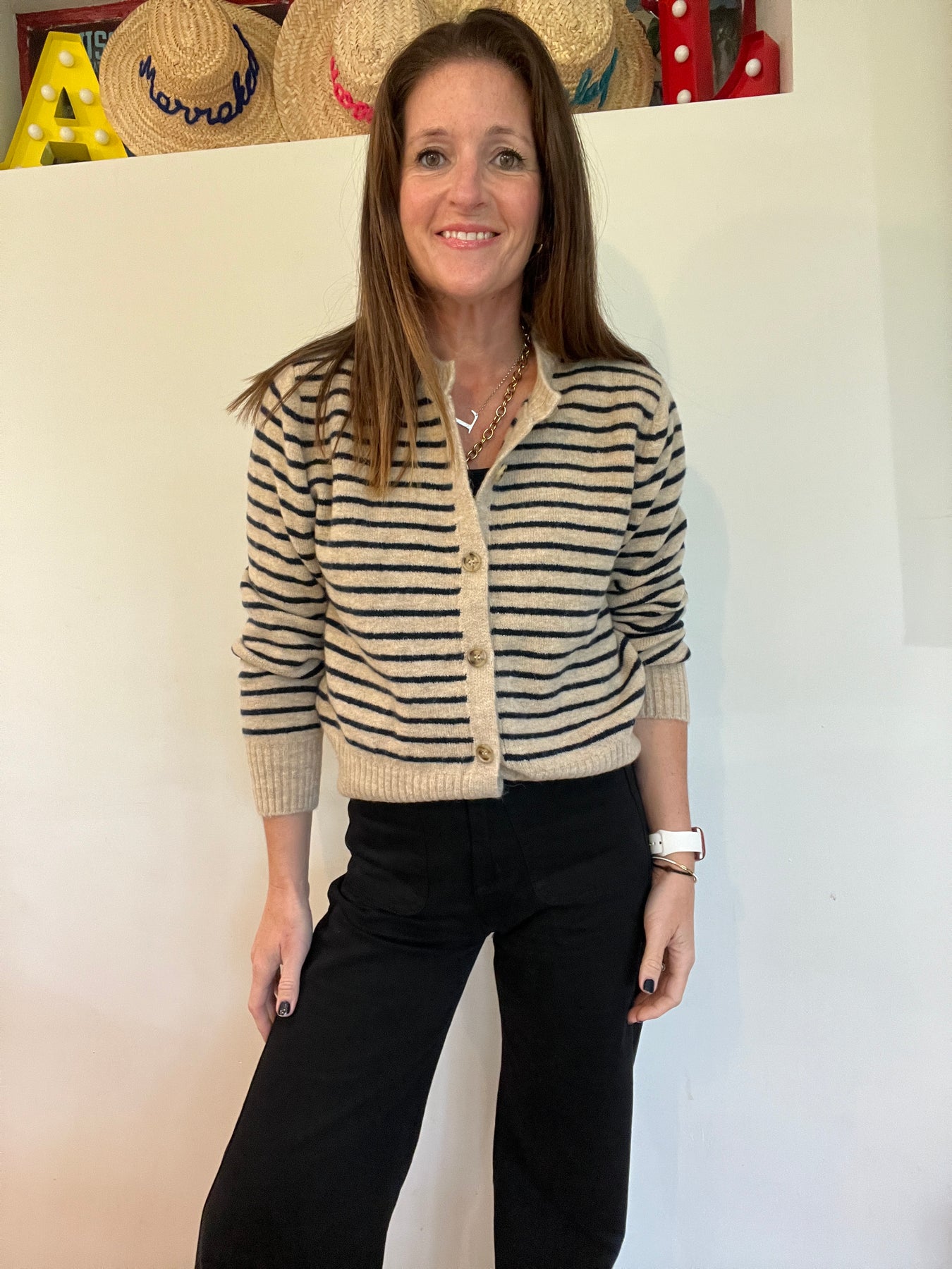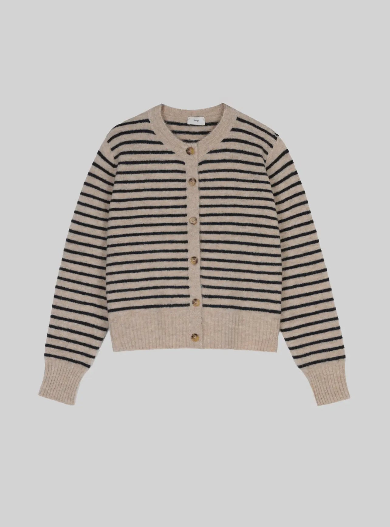 This fitted beige stripe cardigan features a warm knit construction with a round neck and long sleeves, combining comfort with a sleek silhouette.