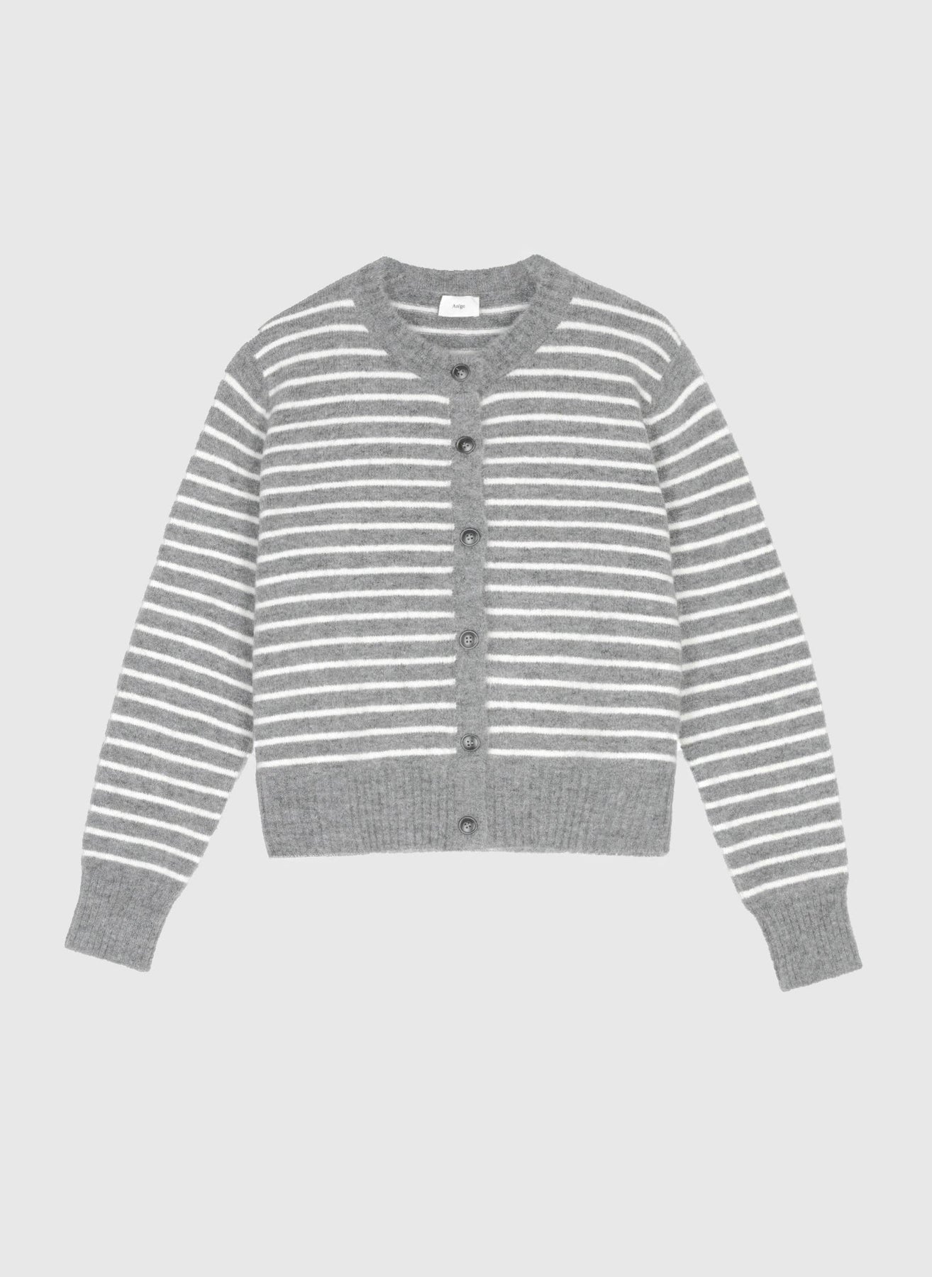 This fitted grey cardigan features a warm knit construction with a round neck and long sleeves, combining comfort with a sleek silhouette.
