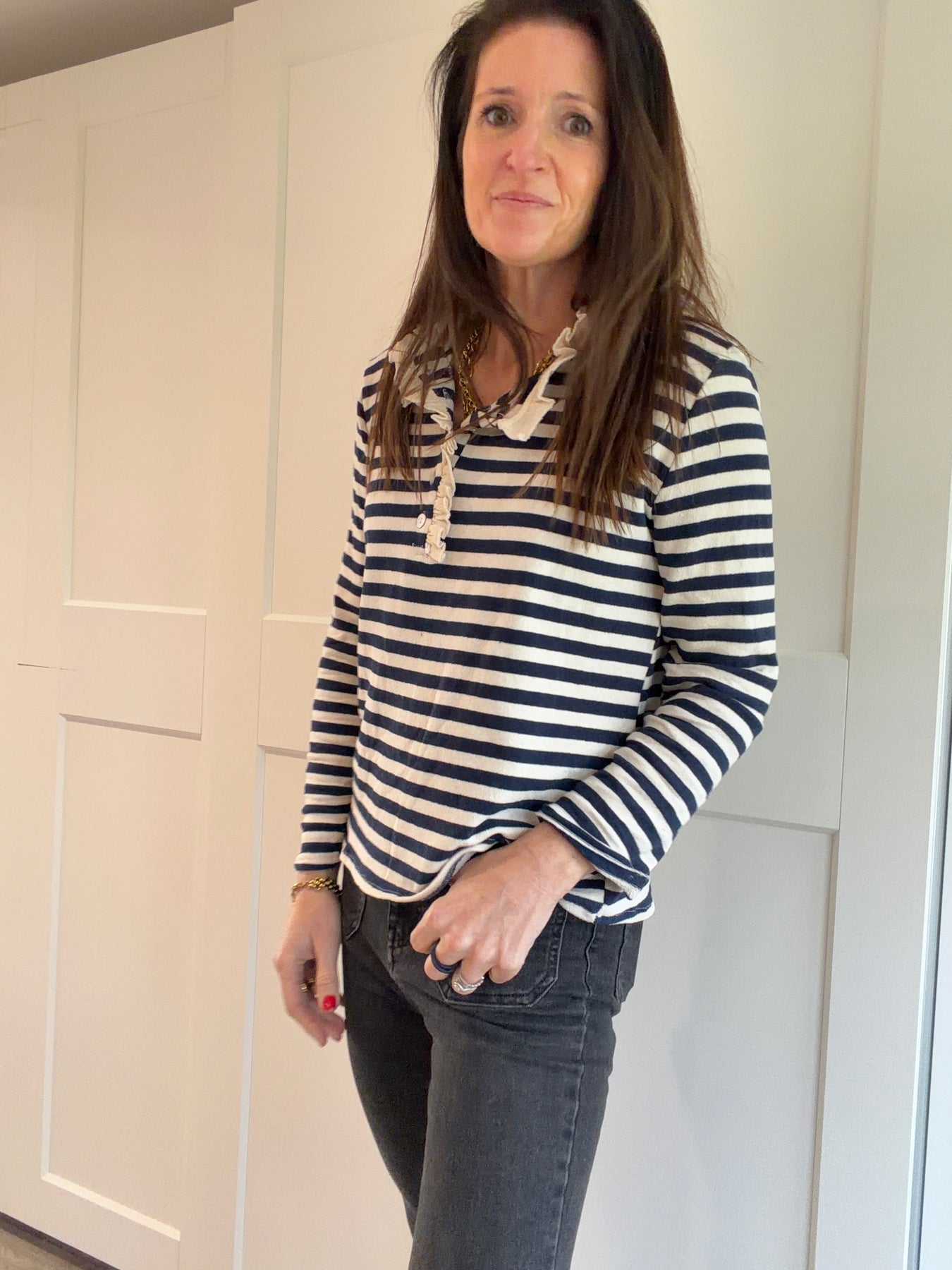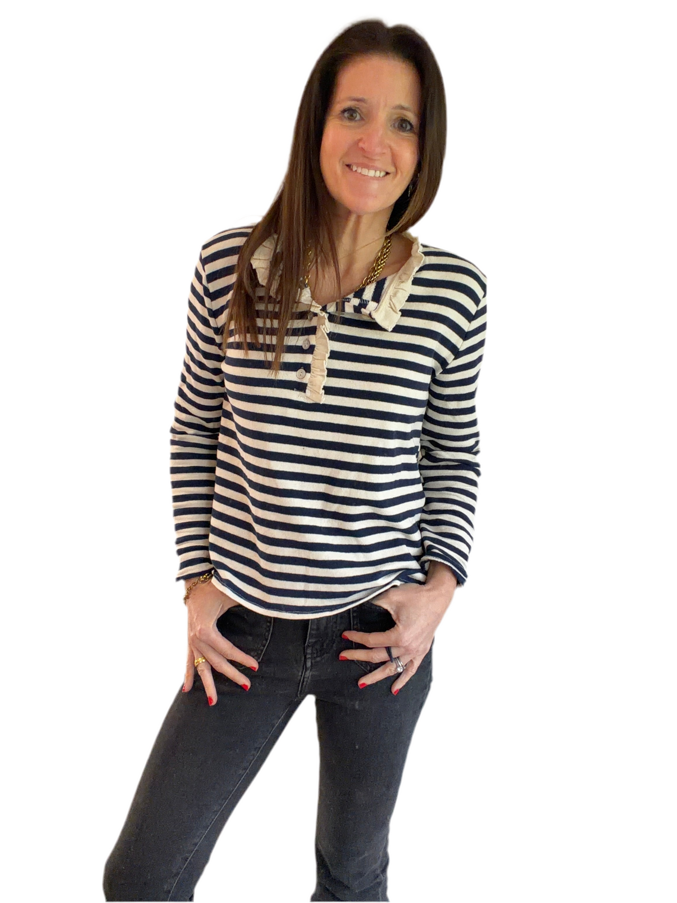 Nautical style with horizontal stripes, buttoned Henley collar adorned with a feminine ruffled finish, long sleeves.