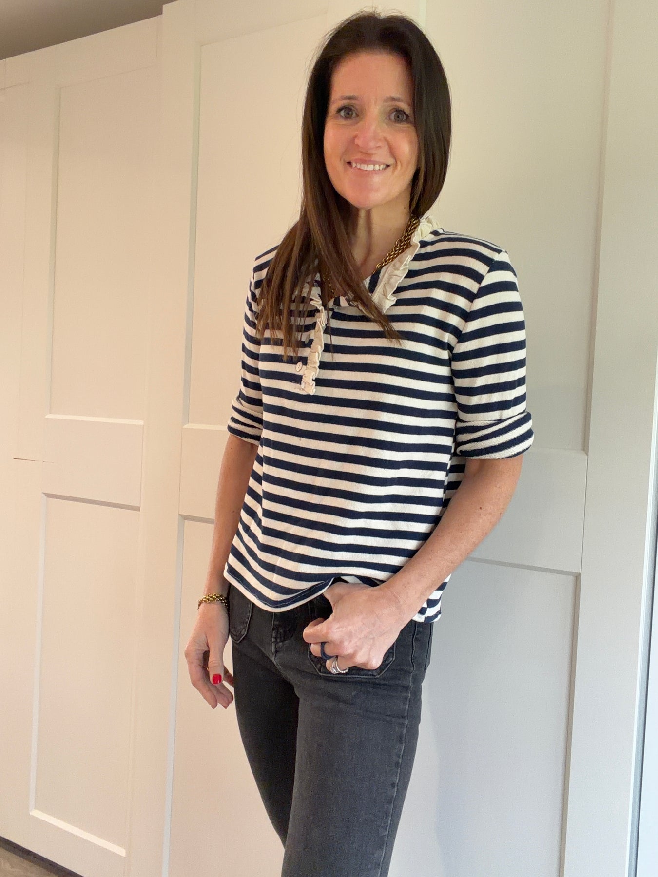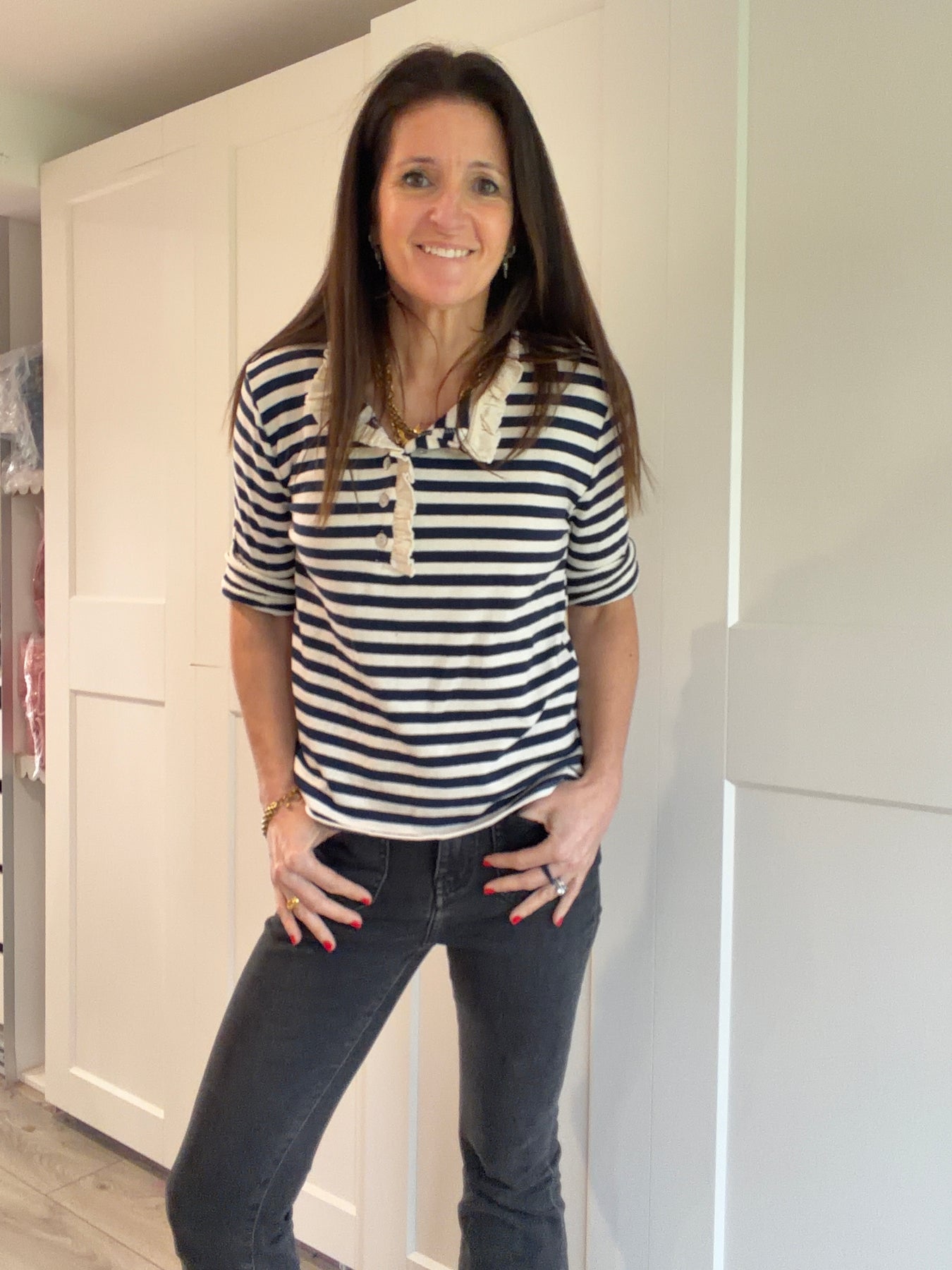 Navy Stripe Henley Ruffled Collar Top