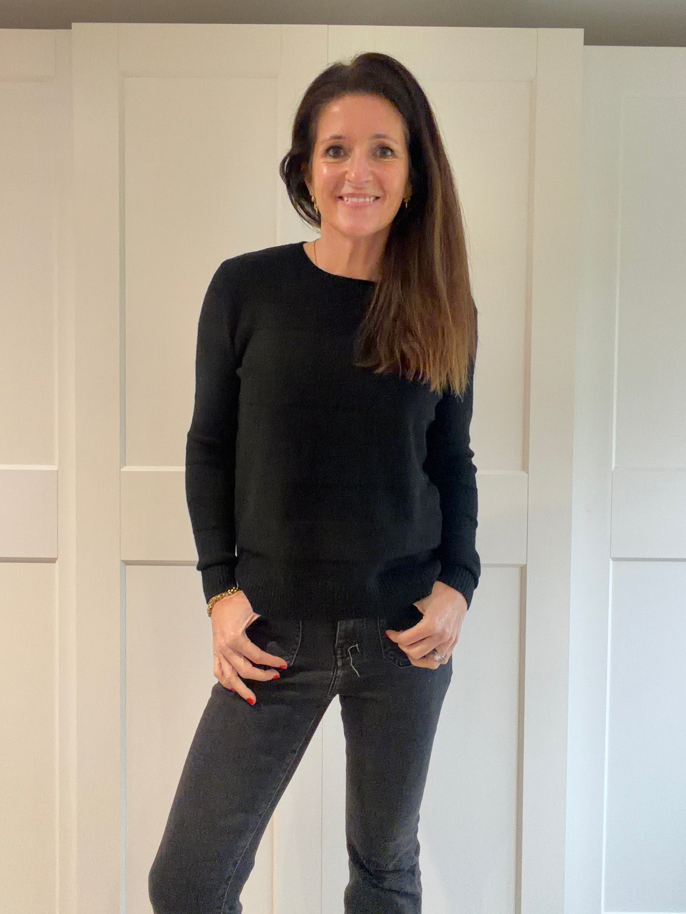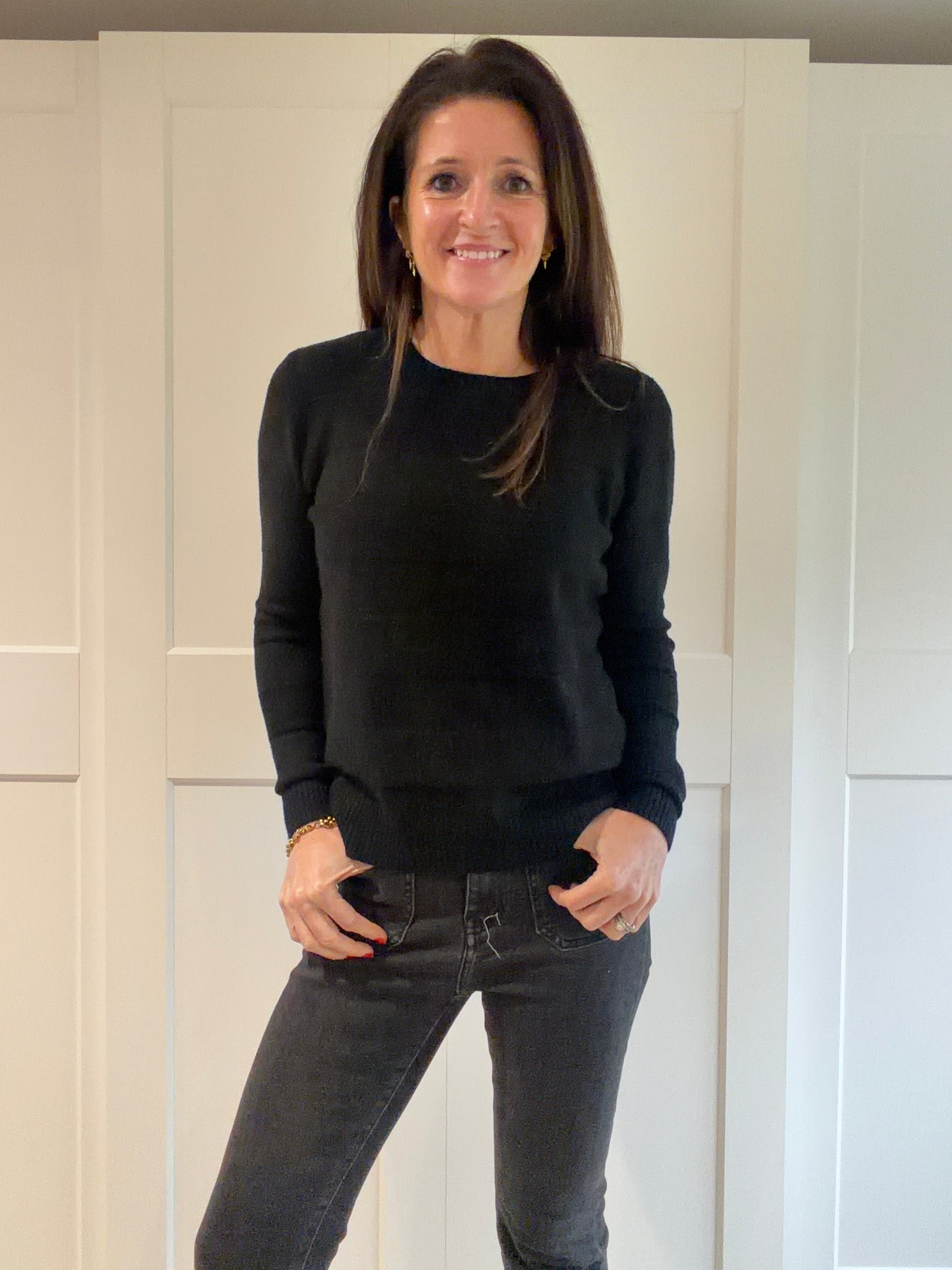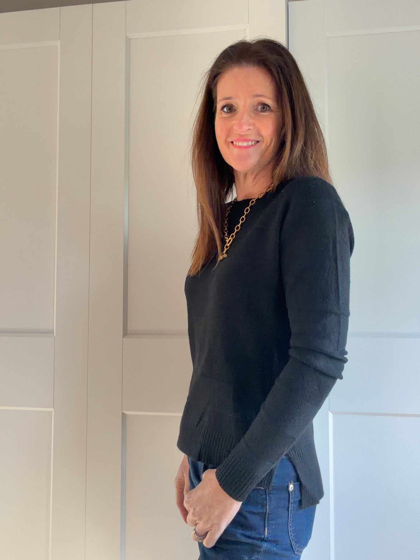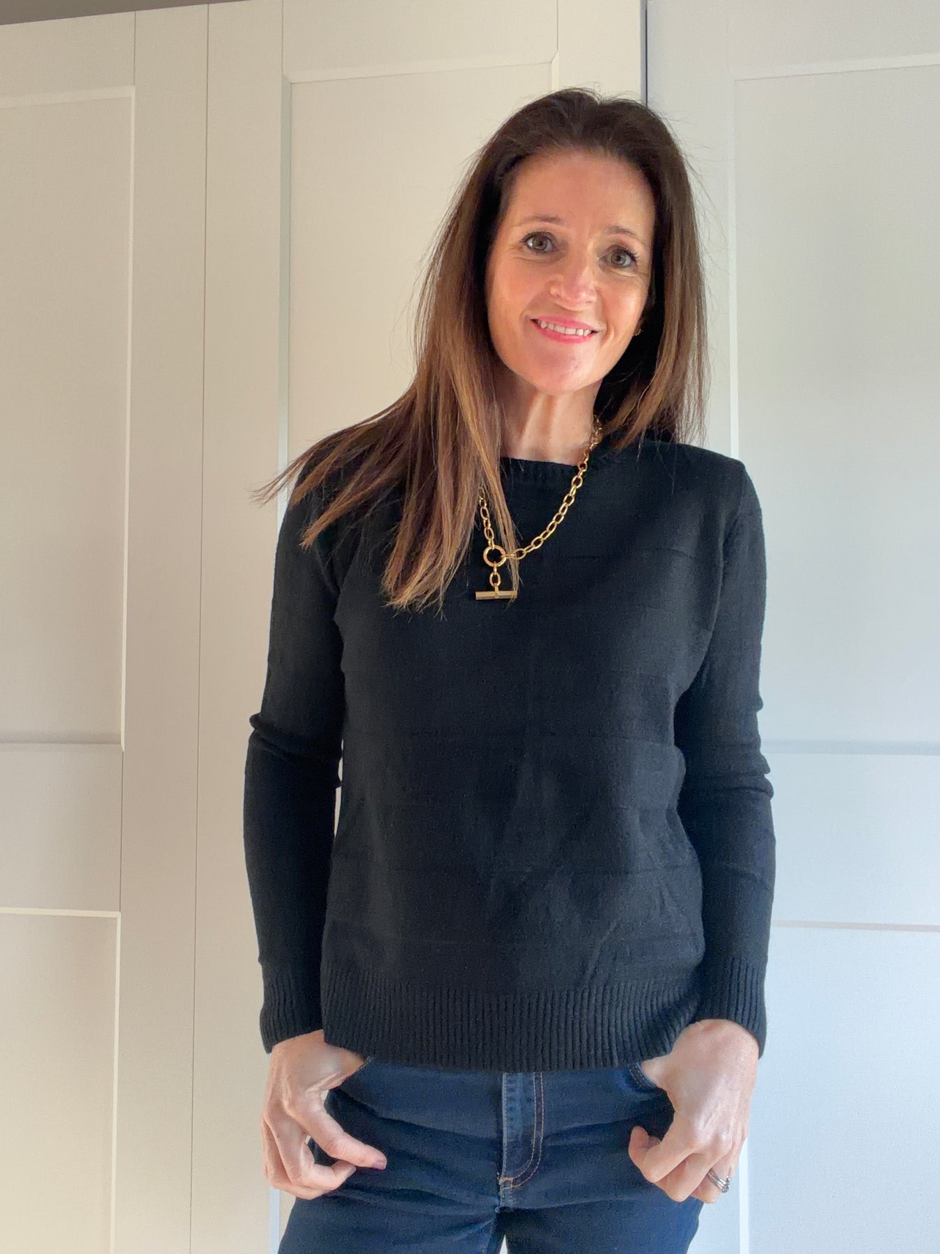 A very soft (nothing needed underneath) subtle wide stripe jumper with small split at the side which makes it sit nicely