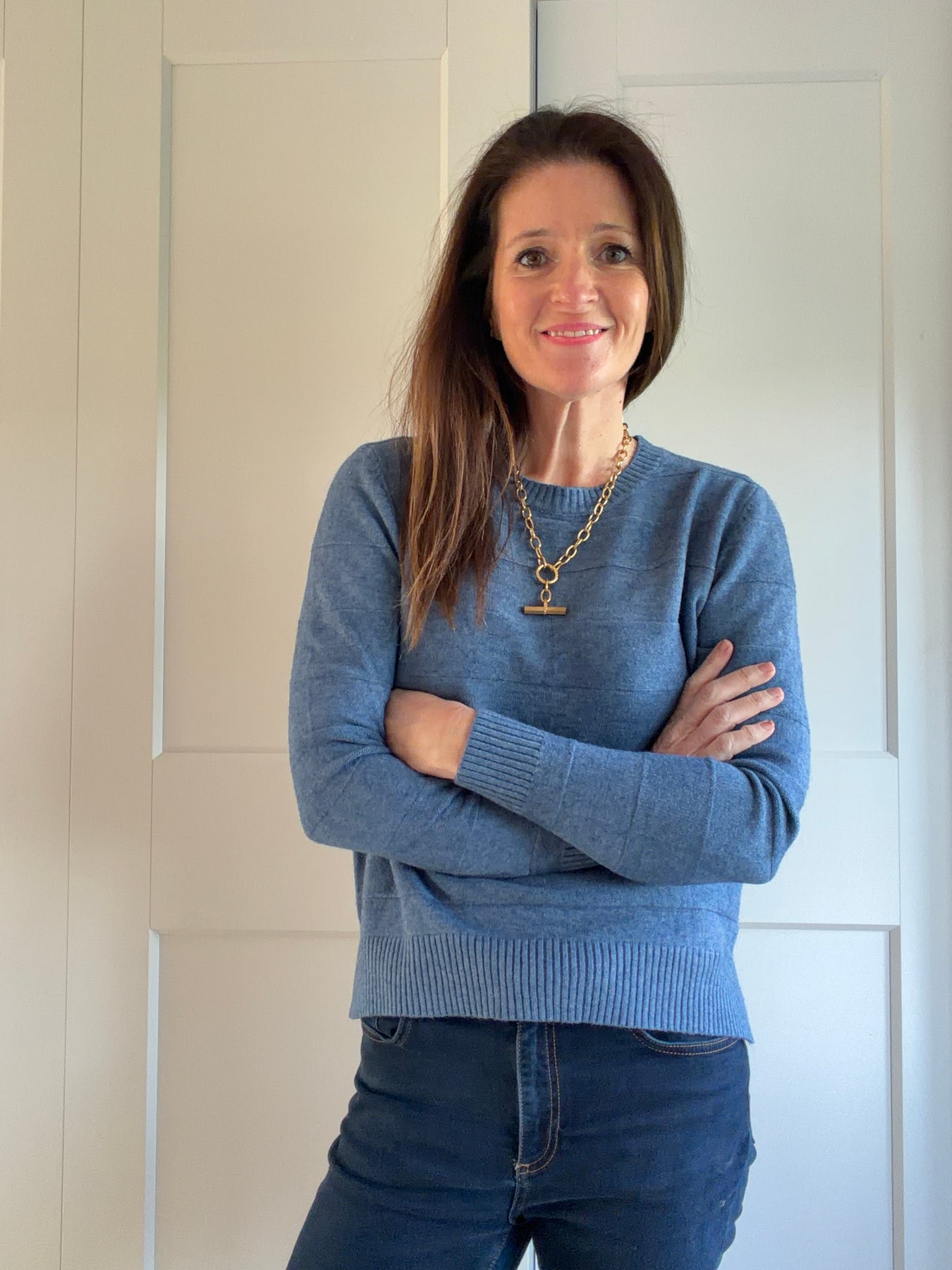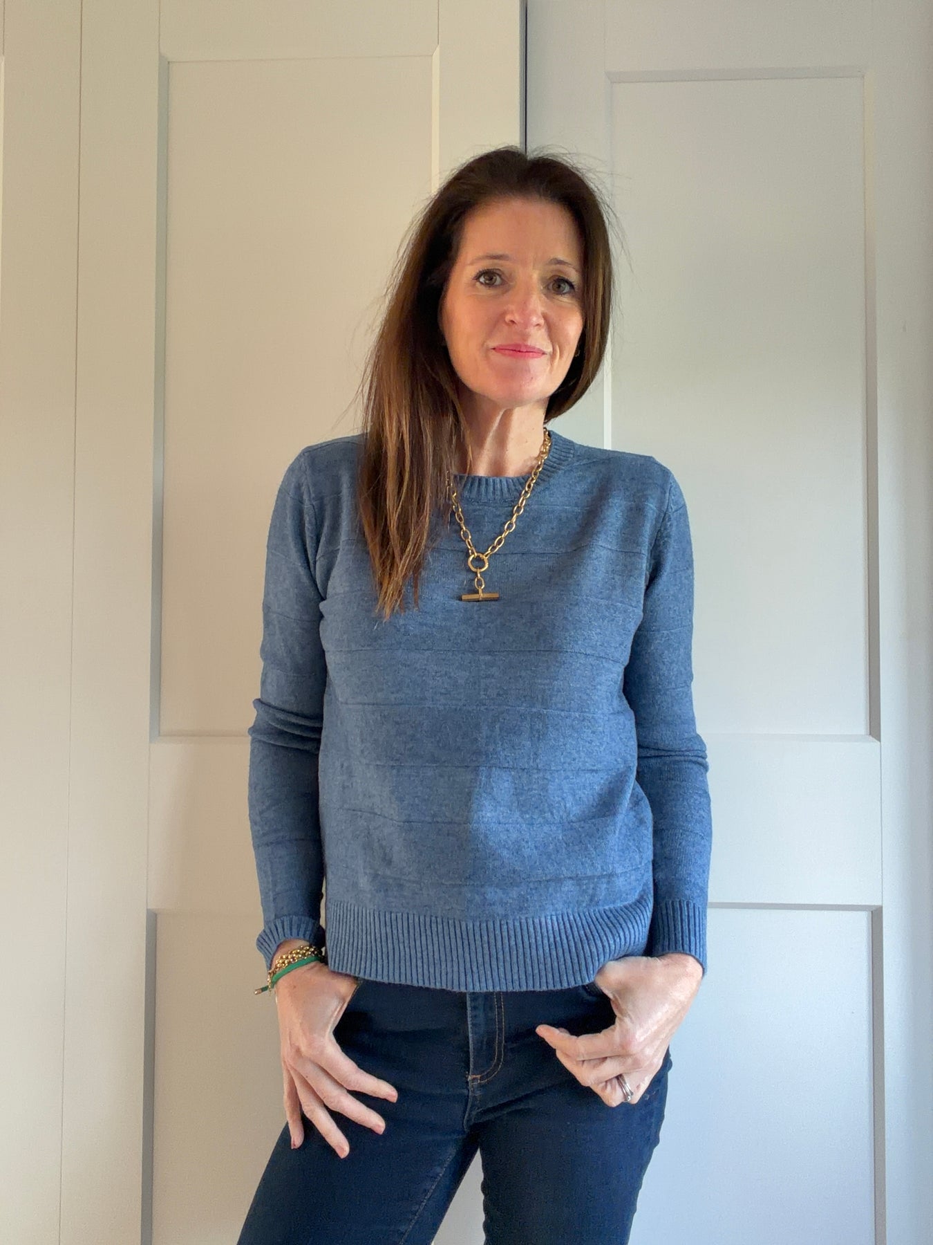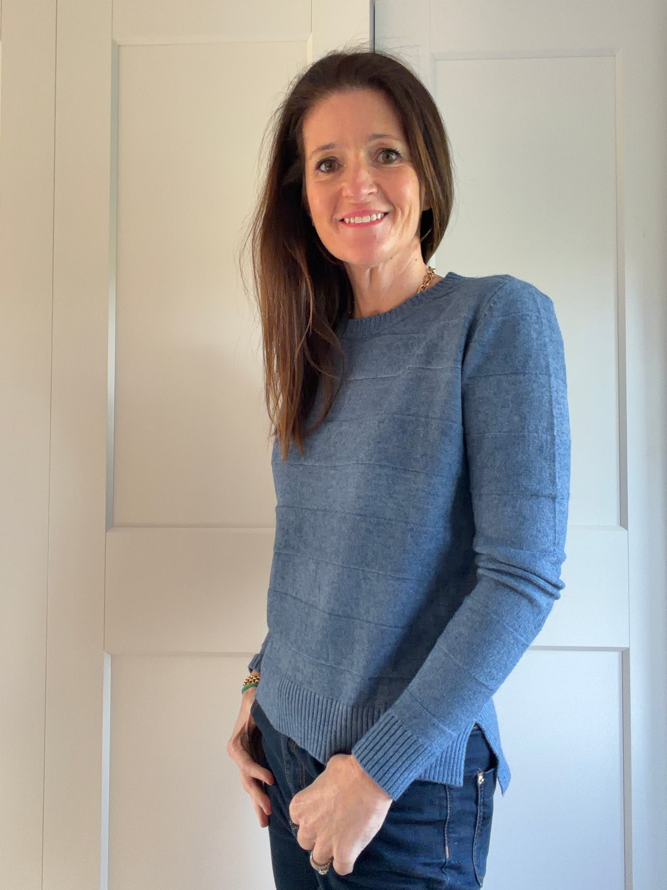 A very soft (nothing needed underneath) subtle wide stripe jumper with small split at the side which makes it sit nicely
