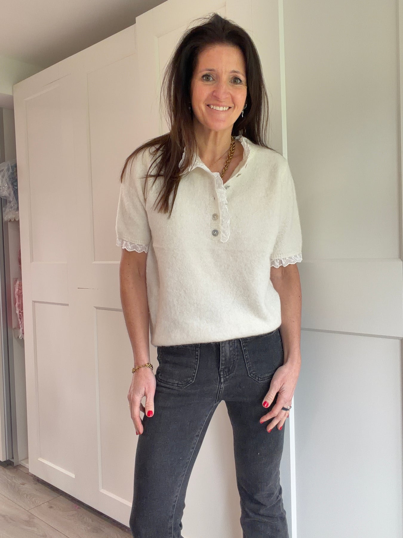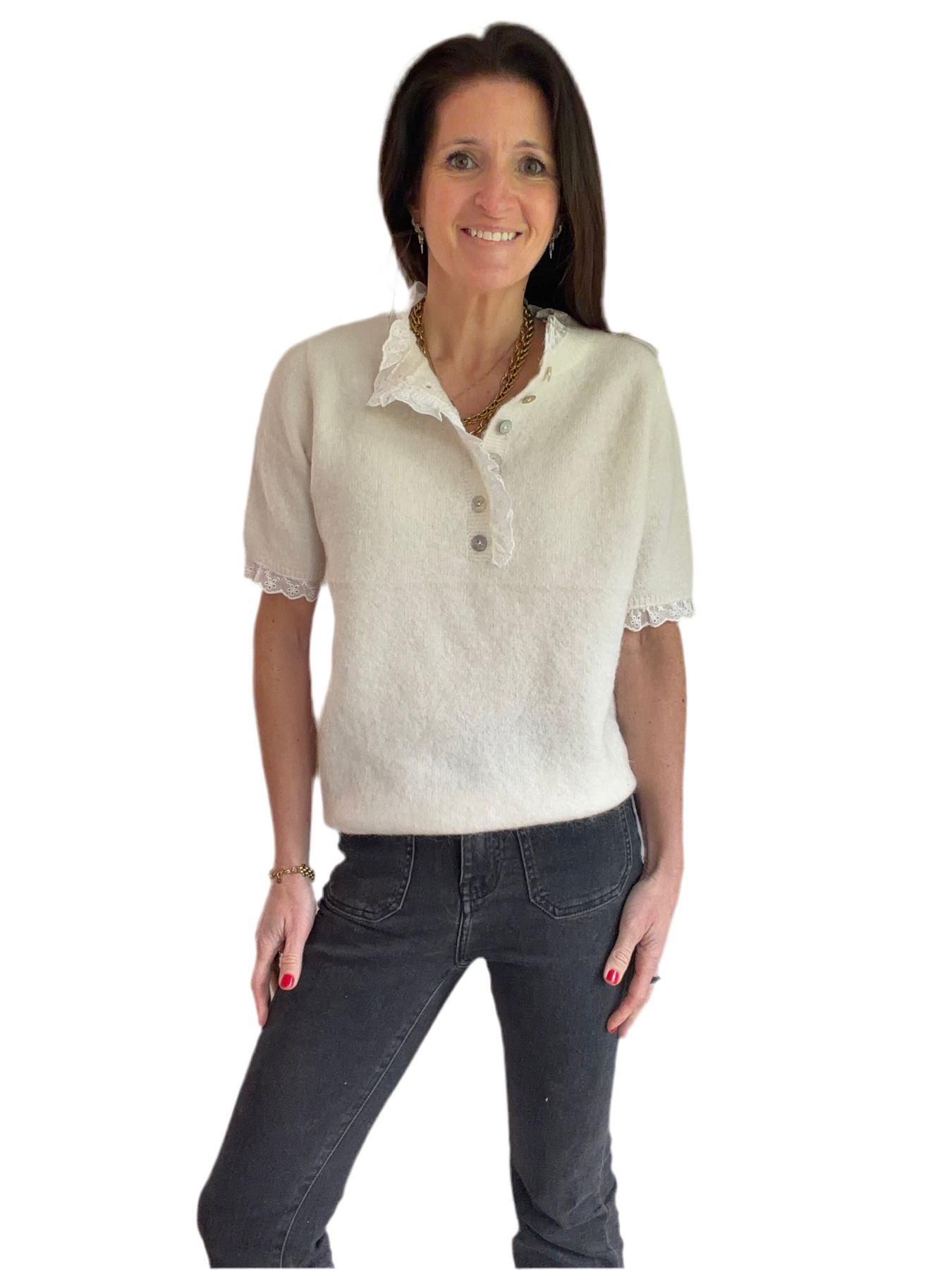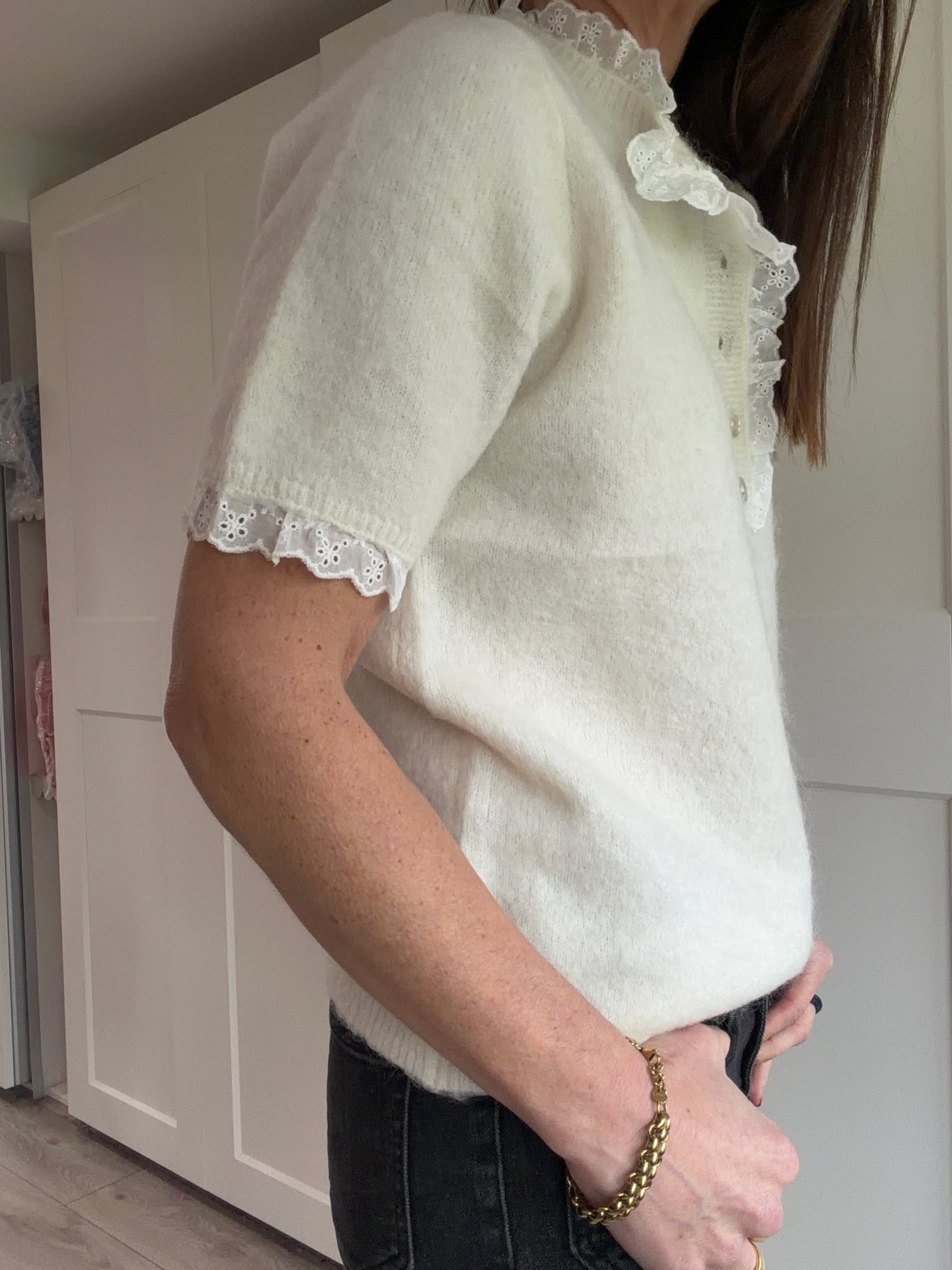 Short Sleeve Broderie Collar & Cuff Cream Jumper