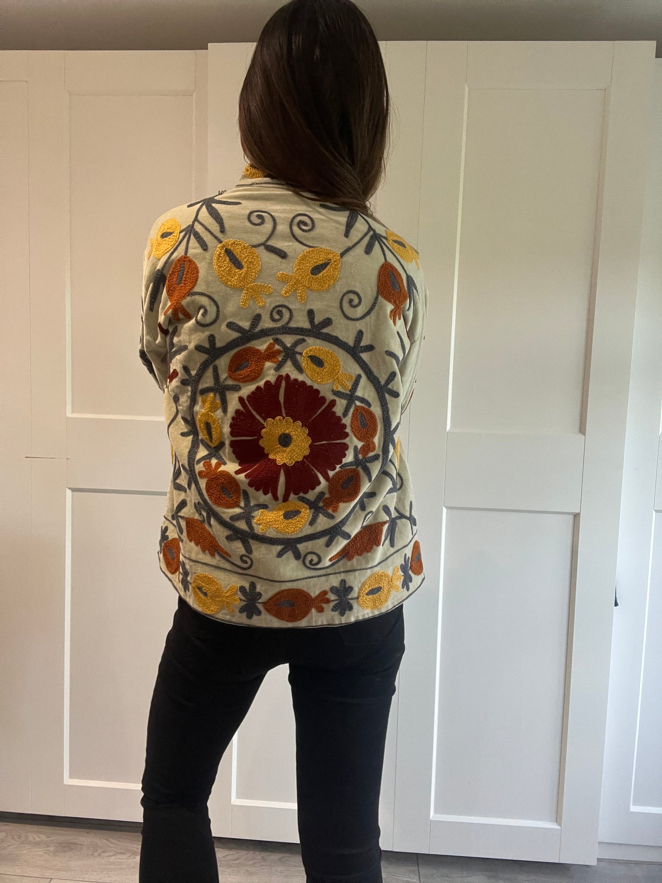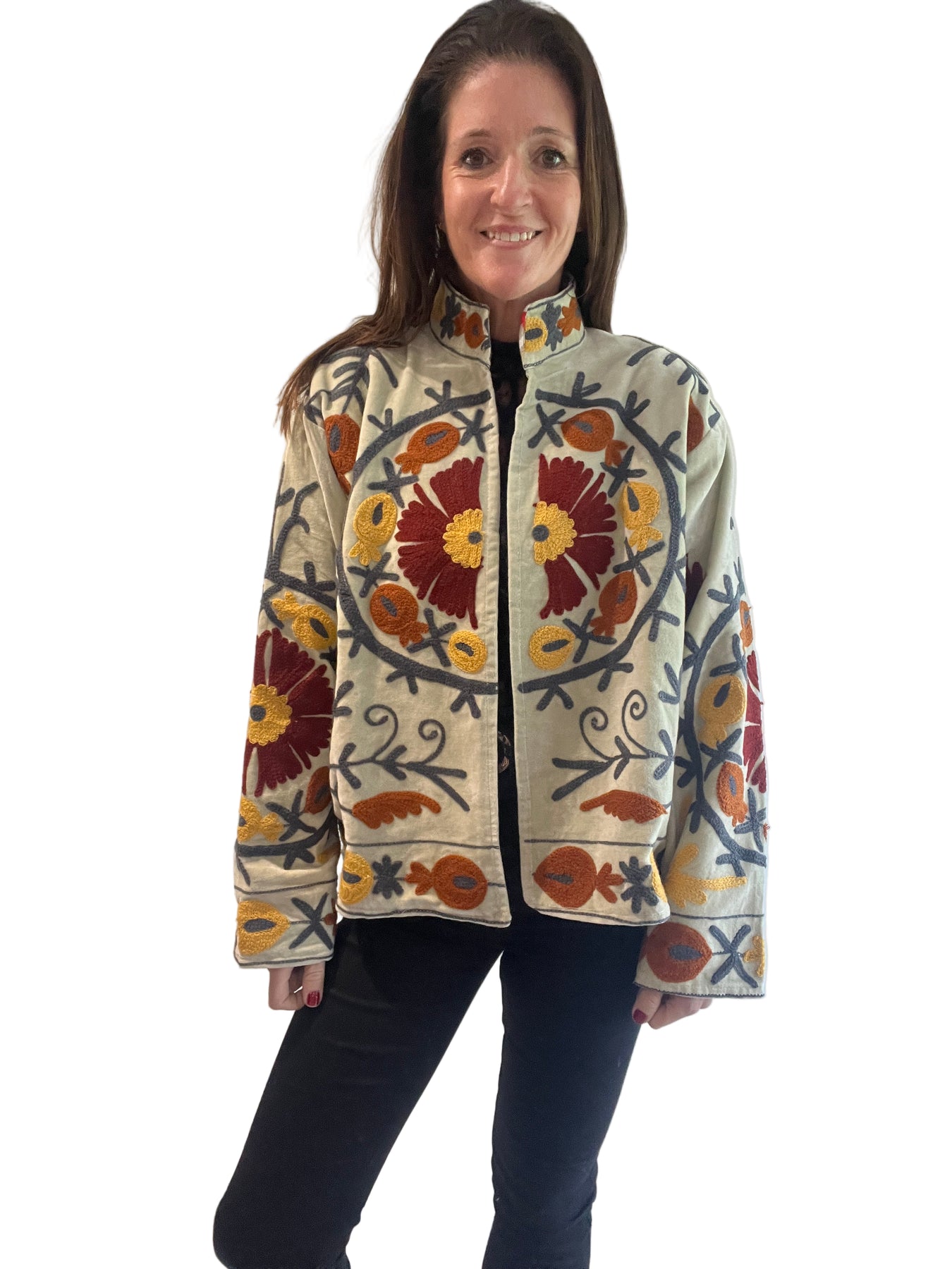 Discovered on my recent trip to India, these Suzani Jackets were personally chosen for my customers for their exquisite craftsmanship and timeless appeal. Each jacket is hand-embroidered by skilled artisans in Jaipur, showcasing intricate traditional Suzani motifs that make every piece truly one of a kind.