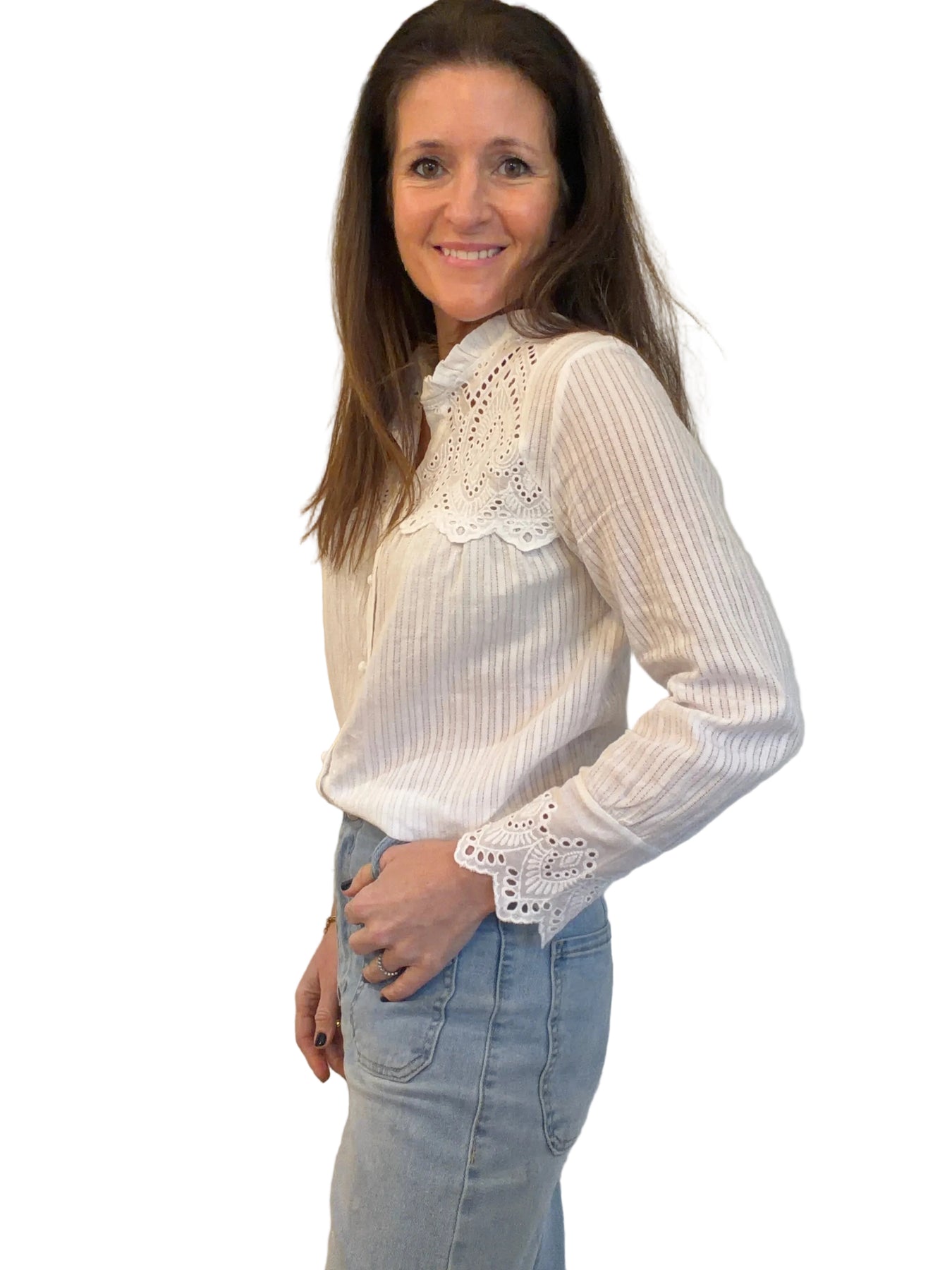 A useful frill neck broderie sleeve button fronted blouse, perfect to wear under a jumper or knitted tank.